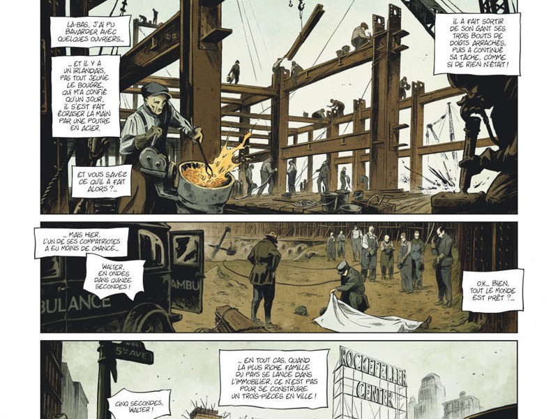 La Grande Dépression est la première crise majeure de l'économie américaine. Afin de redynamiser le pays, les autorités ont lancé une politique de grands travaux, c'est notamment le cas de l'emblématique famille Rockfeller qui a perdu près de 80% de sa fortune suite au krack boursier. Mikaël nous plonge avec brio dans l'ambiance new yorkaise des années 30 où l'on suit le quotidien difficile des ouvriers. Giant est profondément marqué par la disparition d'un ouvrier emporté par un accident, et reprend finalement goût à la vie à travers une identité fictive, celle de la victime écrivant à sa femme et lui décrivant son quotidien pesant. Évidemment, la situation se délite au fil des pages, et la tragédie semble inévitable. Réponse en janvier 2018, à l'occasion de la publication de la fin du diptyque. Le dessin est quant à lui très stylisé, avec peu de couleurs, et une ambiance pesante à souhait.