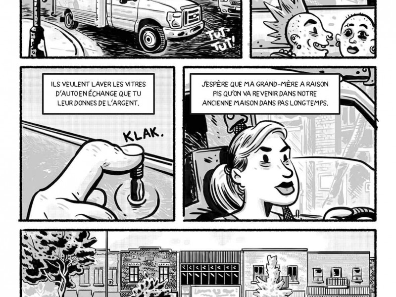 Abordant l’âge charnière entre primaire et secondaire ainsi que la perte de repères causée par un deuil et un déménagement, Geneviève Pettersen signe un scénario qui flirte avec le fantastique tout en étant bien ancré dans le quartier de Rosemont, à Montréal. Avec ses illustrations en noir et blanc, ses cases claires et expressives, François Vigneault a créé un visuel parfait pour le public cible, les lecteurs de 10 ans et plus. Avec ce premier tome de ce qui deviendra une série, Geneviève Pettersen écrit un récit à la hauteur de son personnage principal, Alexis, 12 ans. C’est ainsi qu’elle touche à la fois à l’universel avec des thèmes comme le deuil (celui de la mère est d’ailleurs aussi très bien représenté et émouvant) et le déracinement, tout en restant bien ancrée dans les préoccupations du quotidien (le jus de prune au moment de l’annonce de la mort du père, le besoin de savoir si les dépanneurs de Montréal vendent les mêmes popsicles qu’à Chicoutimi, le téléphone « low bat » qui rend la communication difficile avec un ami). On sent aussi toute la vie de ce quartier et de ses habitants qui n’y sont pas des étrangers les uns pour les autres. Et puis il y a cet aspect plus fantastique avec Ernest et ses mystères, son appartement qui sent le renfermé et ses réflexions étranges sur la mort du père d’Alexis. Une bande dessinée étant toujours un travail d’équipe, l’apport de François Vigneault est important. Ce qui frappe d’abord, c’est l’omniprésence des détails que reconnaitront les Rosemontois, tant dans les représentations extérieures qu’intérieures des appartements. Avec un côté un peu « comic », les personnages sont quant à eux faciles à reconnaitre et expressifs. Finalement, le jeu des grisés avec des cases plus pâles quand on est dans les souvenirs ou les rêveries ajoute du dynamisme.