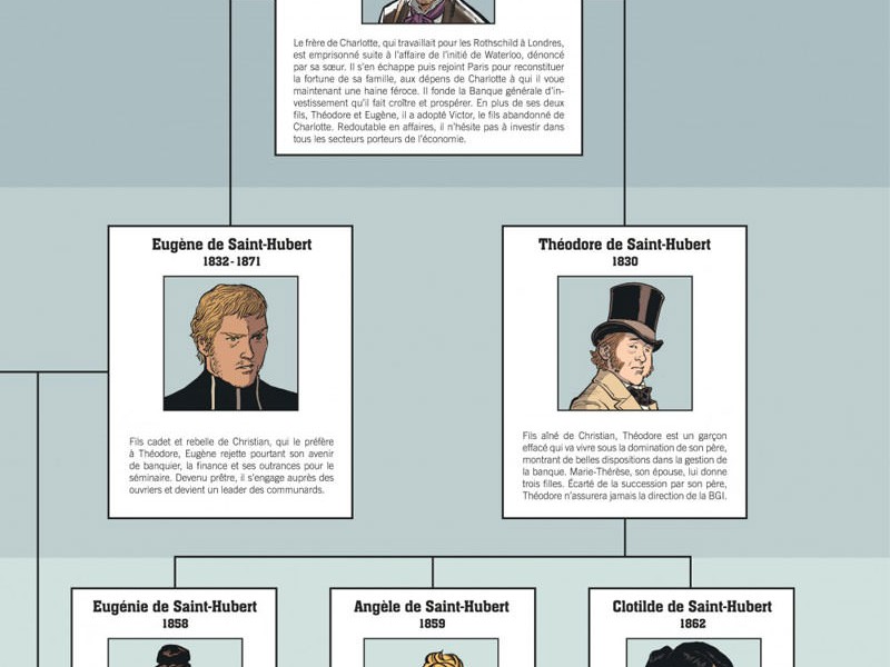 Le scénario de la Banque est très ambitieux, et le traitement de la période historique se fait de manière assez vraisemblable. Le point marquant de cet arc, c'est la vie de la banque durant les premières années de la IIIème République, une ère de grands travaux (Tour Eiffel, Canal de Panama, etc). Mais il est aussi question de l'emprunt russe lancé par le tsar Alexandre III en personne, visant à moderniser les infrastructures du pays, un placement qui fait fureur auprès des banques hexagonales qui vont se disputer les commissions tirées du placement de ces emprunts auprès des épargnants français et qui conduira à une catastrophe économique. Joseph de Saint Hubert, patron de la Banque Générale d'Investissement, n'y prête guère attention, préférant se tourner vers les innovations d'alors, à savoir l'automobile et bien sur le téléphone. Au niveau dessin, un grand soin a été apporté aux détails, que ce soit du côté des décors ou des personnages. On pourra toutefois reprocher un style un peu trop moderne compte tenu de l'époque visitée. De plus, le traitement des mécanismes financiers demeure un peu trop succinct dans cet opus, malgré la présence d'un supplément de six pages en fin de volume, consacré à la Belle Époque des banques françaises. Le prochain diptyque devrait une fois encore changer drastiquement d'ambiance, puisque nous entrerons en pleine Première Guerre mondiale.