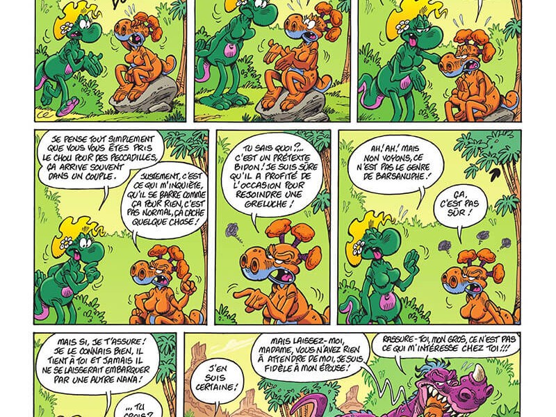 Goulesque et Widenlocher signent un nouvel épisode des aventures "apeupréhistoriques" et franchement loufoques de Nabuchodinosaure, Nab pour les intimes, un bien étrange reptile créé en 1989 qui était porté disparu depuis 2012 (et la parution du quatorzième tome chez Dargaud) avant un retour l'an passé aux éditions Bamboo. Ce nouvel opus de Nabuchodinosaure est constitué de gags essentiellement en une planche et s'avère une bande dessinée qui fera sourire petits et grands. Les dessins sont colorés et expressifs, l'action prend place dans un cadre gentillement loufoque et bourré d'anachronismes (notamment de carcasses de voitures). Dans ce troisième volume, il sera question d'apprendre à marcher au pas, d'escargot hyperactif (un pléonasme) ou encore des amours et du vieillissement des dinosaures.