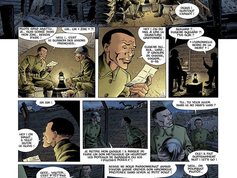 Nous avons fait connaissance avec la belle Bessie Coleman dans l'album précédent. Bessie a grandi dans une famille texane pauvre de treize enfants. Au début de ce deuxième album, nous remontons dans le temps. Bessie n'est qu'une enfant pendant la Première Guerre mondiale lorsque ses frères reviennent des tranchées. Ils ont une très belle surprise pour elle : une photo dédicacée de la grande idole de Bessie : le pilote noir Eugène Bullard. Après tout, ils l'ont sauvé de la mort après qu'il se soit écrasé avec son avion de chasse. Bessie elle-même ne souhaite rien d'autre que de suivre les traces de Bullard et de défricher le ciel en tant que pilote noir. Elle apprend que les Noirs sont traités de manière totalement différente en France et aux États-Unis. En France, il y a beaucoup moins de racisme. Puis nous faisons un bond en avant dans l'histoire et Bessie prend place aux commandes d'un avion avec le célèbre Al Capone comme "cargaison" très spéciale. Le dessin d'Henriet suffit à convaincre, l'apparence de Bessie joue également un rôle. Henriet s'est basée sur des photos existantes, mais il y avait une touche de "Rihanna" dans son physique. Les batailles aériennes sont impressionnantes. Chaque image semble bouger. La scène dans les tranchées du front d'Argonne au début de l'album est également particulièrement intelligente. Henriet utilise toujours une structure de page très claire, ce qui rend la lecture très agréable. Black Squaw est aussi plus qu'une pilote ou une bande dessinée sur les avions. Le côté historique est une grande valeur ajoutée. Il faut également mentionner la coloration par Usagi, la partenaire d'Henriet. L'atmosphère en est grandement renforcée. Par moments, le scénario de cette deuxième partie semble inutilement complexe. Les nombreux lieux et époques différents sont constamment mélangés : les frères de Bessie pendant la Première Guerre mondiale, la rencontre entre Bessie et Al Capone, les enfants amis de Bessie qui jouent un rôle très important, le Ku Klux Klan qui en veut à Bessie, les Black Rattlers pendant la Grande Guerre... C'était un peu délicat par moments car le scénariste Yann a un peu trop de choses dans son assiette ici. Mais l'ouvrage demeure d'une grande qualité ici.