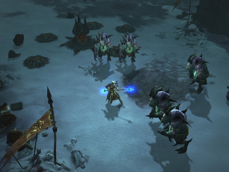 | Editeur : Développeur : Genre : Action/Aventure Multijoueur : Oui Jouable via Internet : Oui Test par  Nic0079/10 Un an et demi après la version PC, Diablo III arrive sur consoles. Un retour attendu.Blizzard savait que Diablo III serait particulièrement attendu par les joueurs, mais il a fallu presque douze ans pour qu'elle voit enfin le jour. A l'instar des précédents volets, le titre permet d'incarner cinq types de héros (barbare, chasseur de démons, féticheur, moine ou sorcier), hommes ou femmes, qui devront se lancer dans une longue quête pour sauver le monde de Sanctuaire des armées des Enfers. L'intrigue prend place vingt ans après les évènements décrits dans Diablo II : Lord of Destruction. Depuis qu'une comète est venue s'écraser sur la cathédrale de Tristram, les morts se sont réveillés. Tandis que Leach recherche son oncle adoptif (Deckard Cain), la jeune fille a une vision. Elle découvre Asmodan qui prépare son invasion du monde. Les possesseurs de Diablo II se retrouveront vite en terrain connu, malgré une réalisation 3D nettement plus probante. Car le style graphique a conservé le même caractère, et la vue demeure assez similaire (même s'il est possible de faire légèrement pivoter la caméra). Toutefois, n'allez pas croire que le jeu ne soit pas au niveau d'un jeu du moment. Au contraire, les environnements sont d'une grande finesse et les animations particulièrement vivantes. On retrouve également les dernières effets spéciaux à la mode, ce qui promet un spectacle son et lumière garanti. Un gameplay prenant.A l'instar de StarCraft II, l'expérience globale est centralisée dans un profil très détaillé. En discutant avec les membres présents sur Battle.net, vous pourrez découvrir où vous en êtes rendu dans la campagne, et il faudra parfois faire des choix dans les évolutions avant d'aborder une future mission. Si les statistiques du personnage évoluent automatiquement, il faut cependant savoir que vous ne disposez que de six cases libres dans les compétences actives. Il est possible de les modifier à tout moment, et la personnalisation offerte s'avère très intéressante. Fréquemment, des cinématiques viendront vous informer de la marche à suivre et illustrer le résultat de vos actions. Notons d'ailleurs que le jeu est intégralement en français. La durée de vie en solo apparaît très confortable, avec une bonne vingtaine d'heures au compteur, et l'interface est d'une rare exemplarité, assurant une prise en main parfaite. Le système de combat est d'une grande souplesse, et la difficulté semble d'ailleurs moins présente que dans les précédents volets. Un sentiment qui ne dure qu'un temps, car d'autres niveaux sont déblocables (Cauchemar, Enfer, Armageddon et Extrême). Dans ce dernier mode, vous ne disposez que d'une vie pour finir Diablo III. Naturellement, vous ne serez pas seuls dans l'aventure, et si des PNJ vous accompagneront ponctuellement dans votre périple, il est possible de bénéficier d'un compagnon de route permanente (brigand, enchanteresse, ou templier). La gestion de l'artisanat à son utilité pour fabriquer ou sertir ses équipements, tandis que le mode coopératif est une option plus qu'appréciable. Mais l'autre grand point fort de Diablo III reste ses musiques, tout simplement sublimes. On retrouve quelques classiques de la saga, mais également de tous nouveaux thèmes. Les dialogues français sont très convaincants, tandis que les bruitages sont assez réalistes. Un portage convaincant ?Dans cette adaptation console de Diablo III, on retrouve tout de même quelques changements par rapport à l'original PC. Tout d'abord, chaque support dispose de serveurs dédiés, et on retrouve un mode quatre joueurs accessible en local. En outre, il n'est pas nécessaire d'avoir une connexion Internet permanente pour jouer. La gestion de l'inventaire a été simplifiée, et vous pourrez déplacer jusqu'à soixante objets simultanément (qu'importe leur taille). A contrario, l'interface est un peu moins pratique que sur PC, et prend cette fois la forme d'un menu radial. L'hôtel des ventes a fait ses bagages, et vous ne pourrez donc plus obtenir des objets contre de l'argent virtuel ou réel, et on constate un nouveau mouvement, l'esquive, réalisable avec le stick analogique droit de la manette. D'un point de vue technique, le rendu est certes beaucoup moins fin que sur PC, mais le titre demeure fort appréciable, et la direction artistique est toujours un régal. Les temps de chargements sont très rapides, l'animation d'une grande fluidité (quelques ralentissements sont toutefois à noter sur PS3) et le spectacle est garanti. VERDICT-Diablo III tient parfaitement ses promesses. La campagne solo se montre originale et particulièrement rythmée, la réalisation s'avère convaincante, et le challenge ne manque pas. Un très grand jeu, qui sied parfaitement aux consoles. |
