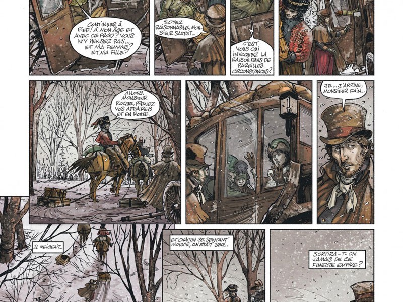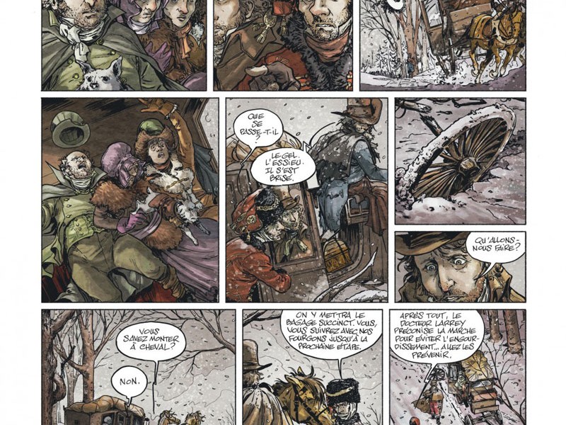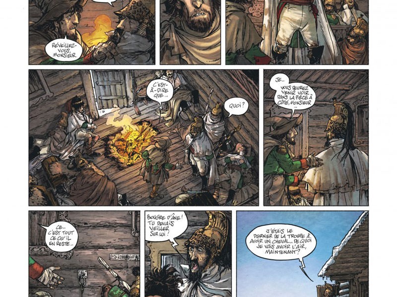 Dans ce tome trois, la Grande Armée peine toujours à regagner la France. Avec une température extérieure de -25°C, l'hiver polaire a déjà fait beaucoup de victimes parmi les hommes de Napoléon. Le matériel a gelé et le 17 novembre, Napoléon se trouve à Krasnoie alors que l'armée impériale russe, commandée par le général Koutouzov, lance une série de manoeuvres, d'embuscades et d'engagements. Ce jour précis, une manœuvre d'intimidation de la Garde impériale dissuada Koutouzov de lancer l’assaut final, et Napoléon sauva son armée de l'anéantissement complet au prix de nombreuses victimes. Le IIIème corps de Ney, qui n'a quitté Smolensk que le matin même et qui progresse vers Krasnoï, refuse de se soumettre (son contingent passera de 15.000 hommes à 800 en moins de trois jours). Le 20 novembre, Ney et Napoléon se retrouvèrent enfin près d'Orcha, les troupes françaises verront cet événement comme une grande victoire. Bérézina nous permet de suivre la grande histoire en compagnie de Napoléon Bonaparte, mais aussi plusieurs de ses hommes, notamment son cuisinier, son valet, un secrétaire attaché au service du baron Fain, l'État-major et les Généraux, ou encore son beau-fils Eugène de Beauharnais. L'occasion de plonger dans la psychologie des personnages, et de découvrir des dialogues très soignés. L'atmosphère est encore plus sombre dans cet épisode, il fleure un parfum de fin de règne dans l'atmosphère glaciale et glaçant de la Russie. Les affrontements vont se multiplier jusqu'au destin tragique que l'on connaît. Les dessins sont quant à eux magnifiques, encore en évolution depuis "La Bataille", avec un trait réaliste et une reconstitution épatante tant dans les costumes que dans les panoramas glaciales de l'hiver russe.