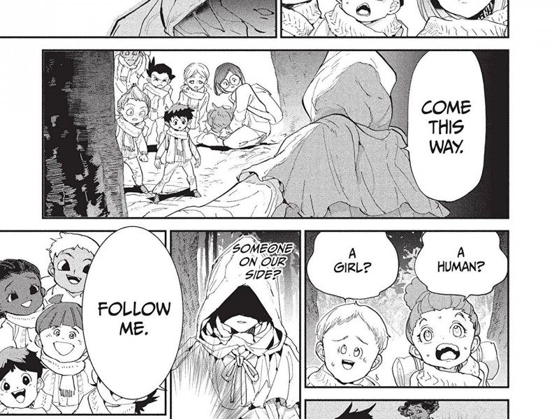 Le volume 5 décrivait l'évasion des enfants du bétail du Grace Field House et le tome 6 les suit à travers la forêt de démons meurtriers alors qu'ils s'aventurent vers les coordonnées B06-32, où ils espèrent trouver William Minerva ou au moins un autre allié. En cours de route, ils se font une paire d'amis improbables : Sonju et Mujika qui sont tous deux des démons. Les démons et les humains peuvent-ils vraiment travailler ensemble ? Ce volume rassemble les chapitres 44-52, qui, bien entendu, sont riches en événements. Du point de vue artistique, Demizu fait du bon travail, comme toujours ici. Les différents environnements du monde des démons ont tous l'air imposants et étrangers, et le manque de connaissance du lecteur sur le monde laisse entrevoir la possibilité que n'importe quoi puisse se cacher dans le prochain coin de rue. Les scènes d'action sont fantastiques, car Demizu utilise une grande variété de compositions de pages qui aident à garder les événements dynamiques et imprévisibles. Sonju et Mujika ont aussi des designs saisissants qui combinent les horribles traits des démons de cette série (dents acérées comme des rasoirs, pieds d'oiseaux, etc.) avec des attributs moins menaçants et plus humains. Sonju et Mujika sont au cœur de la progression de l'intrigue de ce volume, car ils bouleversent la compréhension qu'ont les enfants du monde qui les entoure. Pour commencer, bien sûr, Sonju et Mujika sont des démons, mais ils ne détestent ni ne tentent aveuglément de manger tous les humains. Ils racontent aussi aux enfants le passé du monde, ou plutôt le passé d'un monde. Il est révélé qu'il y avait autrefois un monde singulier, présidé à la fois par des humains et des démons, mais il a été divisé il y a 1 000 ans en deux mondes : un pour chaque espèce. Les implications de cet événement compliquent considérablement les projets des enfants, bien qu'ils reçoivent de nouveaux conseils sur la meilleure façon d'aller de l'avant. Il y a encore quelque chose de sinistre dans l'air, cependant, alors que le lecteur apprend que les motivations de Sonju et Mujika pour aider les enfants ne sont pas entièrement altruistes.