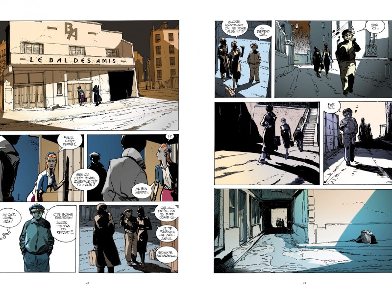 Avec Arlette et Anna, on plonge dans Paris la nuit sous l’occupation avec ses personnages interlopes, ses cabarets miteux et ses bars clandestins. Les salauds ne sont jamais loin, simples minables ou véritables ordures collaborant sans vergogne avec l’occupant. Les pages défilent comme dans un film... normal avec le réalisateur Patrice Leconte comme co-scénariste ! On recherche donc des références cinématographiques. Deux femmes errant la nuit dans la ville ? La traversée de Paris ! Un personnage qui regarde passer les jambes des femmes à travers le soupirail de sa cave ? L’homme qui aimait les femmes de Truffaut ! Et n’oublions pas le dessin de Coutelis. Ses aquarelles et son trait noir parfois épais, toujours précis, rendent parfaitement l’atmosphère sombre et tendue d’un Paris occupé. On retrouve l’esthétique et l’ambiance des années 50 jusque dans la couverture digne d’un film de l’époque. A noter certains visages, détaillés et angoissants, que l’on croirait sortis tout droit d’un Moebius ou d’un album des Méta Barons. Bel hommage au cinéma d’après-guerre, à Modiano et à Marcel Aymé, on se laisse agréablement porter par l’histoire de ces femmes dans la sombre nuit parisienne. Le tome deux nous dira si le film se termine en drame comme dans un Clouzot ou en comédie.