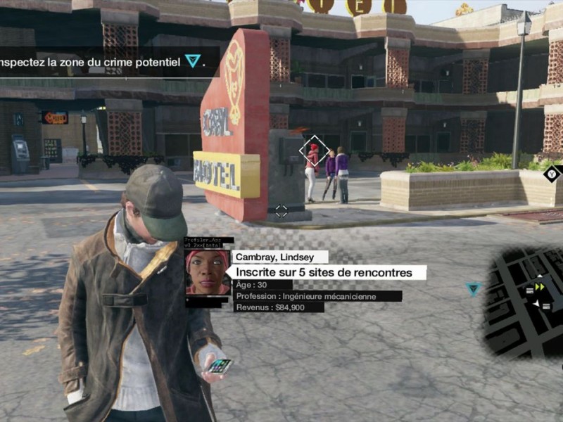 Aiden devra se montrer discret durant l'aventure pour éviter les ennuis, et également résoudre quelques énigmes pour débloquer sa route. Il faut donc utiliser son environnement pour progresser, même si heureusement, nous ne sommes pas démuni en matière d'armement (pistolet, sniper, grenades, etc). Aiden préfère néanmoins les gadgets technologiques pour mettre à mal l'autorité, et grâce à son brouilleur, il est aisé de couper les signaux à proximité (pratique lorsque vous abattez une cible et qu'un passant s'apprête à téléphoner à la police). On pourra également compter sur le scan ctOS pour connaître l'emplacement des ennemis dans un bâtiment, le leurre pour les guider dans un piège, ou encore le Blackout qui neutralise tous les éléments électroniques à proximité de votre position et qui permet donc de fuir rapidement. Notez que toutes ces compétences peuvent être utilisés en voiture, à l'exception des armes à feu. Les phases en voitures (ou à moto) sont très arcade, et on reconnait la touche des développeurs de Driver. La gestion des collisions est quant à elle ubuesque au possible. Pour le réalisme, on repassera. Les phases en bateau sont plus discrètes, mais jouissent d'une physique assez appréciable (surtout celles de la mer). Watch Dogs conserve des bases proches d'un Assassin's Creed, aussi on navigue donc assez vite en terrain connu, et la liberté de déplacement est quasi totale. La ville de Chicago garantit un terrain de jeu plutôt large (bien qu'en deçà d'un GTA V) et il ne devrait pas être compliqué de jouer au jeu du chat et la souris avec les forces de l'ordre. Outre la campagne principale, Watch Dogs comporte de multiples quêtes secondaires facilement retrouvables dans le menu progression. Pour résumé brièvement, vous aurez à mettre à mal des escortes criminelles (soit en éliminant l'une des cibles soit en l'assommant), accepter des crimes détectés (il s'agit de suivre une victime ou un criminel potentiel et d'intervenir afin d'empêcher un drame ... comme dans Person of Interest), effectuer des contrats de fixeur (il suffit de s'assurer qu'une livraison arrive à bon port), ou encore de pénétrer dans les planques de gang (vous naviguez dans une zone hostile et devrez repérer un chef de gang puis le neutraliser sans le tuer). Les enquêtes ne sont quant à elle accessibles qu'une fois débloquées auprès des tours ctOS. Au programme, de la récupération d'objets, la recherche de codes QR, ou encore la découverte d'une scène de crime. Quelques mini-jeux sont également de la partie, avec du poker (Aiden peut mesurer le degré de stress des participants), des échecs à finir en un minimum de coups, et bien sur du classique bonneteau dans les rues lugubres de la ville. Enfin, les Digital Trips (des séquences sous acide) sont proposés, et permettent de s'amuser en dehors des sentiers battus. Une progression dirigiste ?Contrairement à ce que l'on aurait pu penser, Watch Dogs n'impose finalement que peu de choix. Une fois la mission présentée, libre à vous de déterminer comment venir à bout de votre objectif, et si vous souhaitez employer la manière forte ou privilégier la discrétion. On pourra trouver un certain côté Splinter Cell en détournant l'attention des gardes, en créant des diversions ou en utilisant les caméras pour repérer la position des gardes. Quelque soit l'option choisie, les affrontements sont d'un grand dynamisme, et certaines séquences sont d'ailleurs assez violentes (oui le jeu est 18 + rappelons le). En outre, l'intelligence artificielle est une vraie surprise et marque une progression depuis la précédente génération de consoles en affichant des réactions beaucoup plus pertinentes. Si vous ratez un objectif, lorsque vous recommencerez la mission, les gardes ne seront plus les mêmes et il faudra modifier votre stratégie ! Si vous êtes repéré par un ennemi, il faudra fuir rapidement ou sortir les armes à feu, les concurrents étant pour le moins agressifs. Et si un cadavre traine quelque part dans un bâtiment, ils n'hésiteront pas à lancer l'alerte (l'alarme peut être bloqué si vous piratez les communications, ce qui consomme toutefois quelques points de batterie). Les habitants de Chicago sont très nombreux à se balader dans les rues, soit autant de victimes potentiels pour Aiden. Avec le profiler, vous pourrez connaître précisément leurs identités et même leurs revenus. Certains personnages pourront être piratés ce qui vous offrira la possibilité de retirer de l'argent dans un distributeur automatique, mais aussi de récupérer quelques éléments pour crafter les outils de piratage. Enfin, à l'instar du récent inFamous, les actions effectuées dans Watch Dogs auront des conséquences sur la réputation du personnage. Si vous décidez d'opter pour une approche morale de l'aventure, en sauvant des civils ou en arrêtant des voleurs, les habitants vous considéreront comme un justicier. A contrario si vous détruisez tout sur votre passage, les gens n'hésiteront pas à appeler la police ... Techniquement à la hauteur ?
