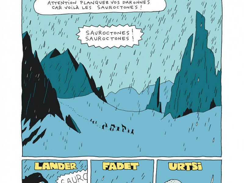 Dans un monde post-apocalyptique passablement dégradé, trois adolescents ne se contentent pas de survivre. Non. Pour différentes raisons et, disons le, un peu à l'insu de leur plein gré, ils se retrouvent à affronter d'affreuses bestioles (mille-pattes géants, spasmo-chenilles, etc.) et des méchants en tous genres. [Wikipedia nous explique que les Sauroctones sont des personnes, souvent des saints locaux, chassant les dragons.] Cette série d'Erwann Surcouf nous surprend en permanence, par son mélange de genres, par son dessin étonnant (quelque part entre Riad Sattouf et Brüno), et par son scénario qui semble partir dans tous les sens mais finalement structuré et très riche.