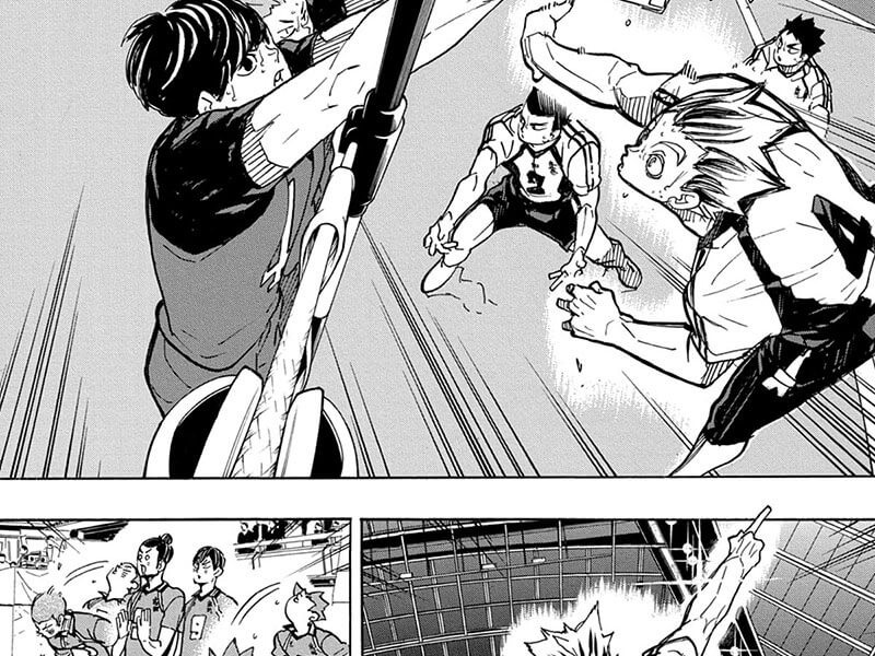 Ce tome 38 continue là où le tankobon précédent s'est arrêté et contient les neuf prochains chapitres (332-340) de la série manga en cours. Cet opus conclut les quarts de finale du tournoi national de printemps des lycées entre Mujinazaka High et Fukurodani Academy. Mujinazaka High prend une avance précoce en remportant le premier set, mais Fukurodani Academy parvient à gagner les deux sets suivants, remportant ainsi le match et se qualifiant pour les demi-finales. Le score du match est le suivant : 25|1|23, 22|2|25, et 22|3|25. Le dernier tiers du manga débute le match de quart de finale entre Karasuno High et Kamomedai High. C'est un match particulièrement intéressant, car Korai Hoshiumi de Kamomedai est surnommé le "Petit Géant" et Shoyo Hinata de Karasuno, admire l'original, Tenma Udai, et veut être comme lui. Le tankobon ne va pas plus loin dans le match et se clôt sur un score de 1|1|2, Karasuno étant derrière d'un point. Bien que ce fut une pause agréable de voir une autre équipe concourir, il est plutôt agréable de recentrer le récit sur Karasuno High.