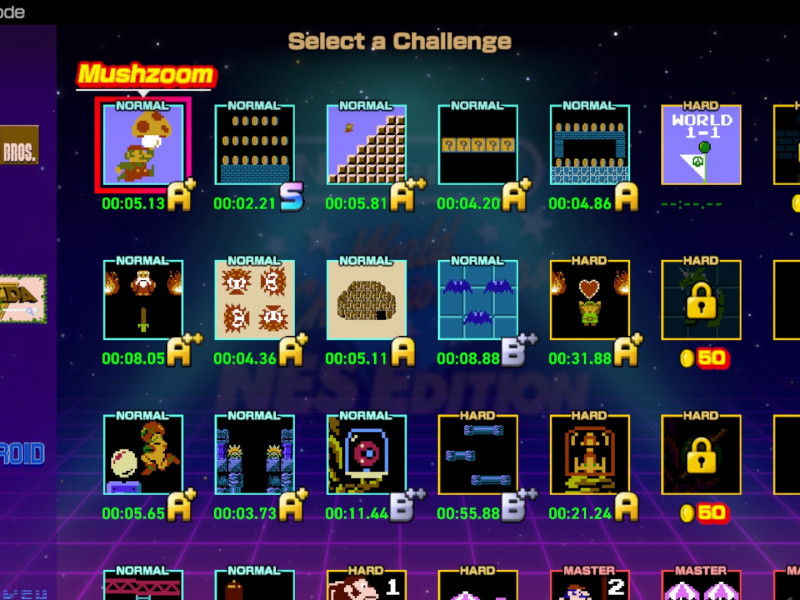 Balloon Fight, Donkey Kong, Excitebike, Ice Climber, Kid Icarus, Kirby's Adventure, Metroid, Super Mario Bros., Super Mario Bros. 2, Super Mario Bros. 3, Super Mario Bros. : The Lost Levels, The Legend of Zelda et Zelda II : The Adventure of Link - voilà le riche menu des titres du Nintendo World Championships : NES Edition, ceux-là même dans lesquels vous pouvez vous essayer à plus de cent cinquante défis. Les défis vont de la simple obtention du Super Champignon dans le niveau 1-1 de Super Mario Bros. à la découverte de l'entrée secrète du donjon dans le tout premier The Legend of Zelda, en passant par l'escalade des plates-formes dans Ice Climbers pour atteindre le sommet. Grâce au chronomètre, vous pouvez obtenir une évaluation de vos temps et battre vos propres records en défiant les fantômes. En réussissant les défis, vous gagnerez des points qui vous permettront de débloquer de nouveaux stages ainsi que de jolis pins et avatars à exhiber dans le multijoueur en ligne. Ce dernier mode est le véritable joyau de Nintendo World Championships : NES Edition : vous pouvez vous essayer à différents défis multijoueurs, tels que les tournois mondiaux, une série de défis hebdomadaires sélectionnés dans lesquels les joueurs devront s'affronter avant que les résultats ne soient publiés, ou les tournois de survie, une sorte de bataille royale en écran partagé où vous devez compléter une série de défis et obtenir un bon classement pour éviter d'être éliminé. Le multijoueur local ne manquera pas non plus, grâce auquel vous pourrez vous défier en temps réel sur le même écran et avec la même console en utilisant simplement un Joy-Con chacun, jusqu'à un maximum de huit joueurs. Pour ajouter un peu de piment, Nintendo a imaginé un mode Challenge Set qui vous proposera, à vous et à vos amis, des défis choisis aléatoirement à relever en écran partagé.