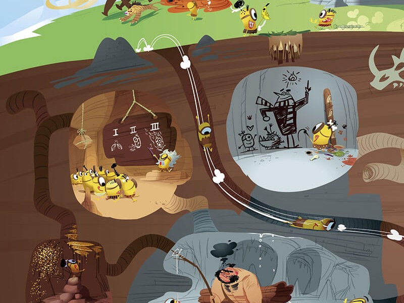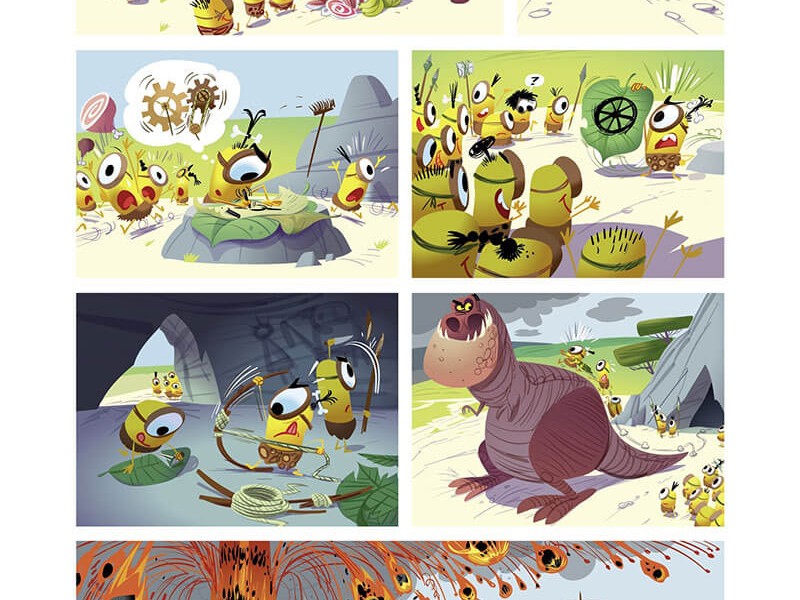 A l'origine de simples organismes monocellulaires de couleur jaune, les Minions ont évolué au cours des âges au service de maîtres plus abjectes les une que les autres. Les disparitions répétitives de ceux-ci, des tyrannosaures à Napoléon, ont plongé les Minions dans une profonde dépression. Entre deux aventures, cette série de BD nous permet de mieux faire connaissance avec les personnages, de découvrir leur mode de vie, leurs expérimentations farfelues (pas autant que dans les Lapins Crétins cela étant), et leur amour inconsidéré pour les bananes. Mais attention, cette fois les Minions devront faire face à la grande Histoire, du far West des cowboys en passant par l'Égypte des Pharaons, du Jurassique à la Renaissance, les Minions vont revisiter les périodes charnières de l'espèce humaine en se mettant à chaque reprise au service d'un personnage célèbre.