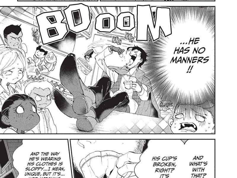 Ce volume impressionne également par la façon dont il élargit les connaissances de la série. Les enfants trouvent toutes sortes d'informations sur le monde dispersées dans les abris souterrains, y compris des cartes des régions voisines. Cette information géographique inclut la première référence directe de la série à Goldy Pond, dont les fans qui se tiennent au courant via Weekly Shonen Jump reconnaîtront l'importance. Les récits de Geezer sur son passé font allusion à diverses menaces inconnues qui génèrent beaucoup de tension et d'angoisse. Les protagonistes ont beaucoup plus à craindre que Isabella et le reste de leurs anciens gardiens. L'œuvre de Demizu est aussi merveilleuse, comme toujours. Les personnages ont tous des expressions faciales et un langage corporel fantastiques. Cela permet au lecteur d'avoir une bonne idée de la façon dont les protagonistes font face à leur situation traumatisante, non seulement dans les moments de tristesse mais aussi dans les moments de joie. Il y a une quantité inattendue de comédie dans ce volume, et une grande partie de son succès provient du travail effectué sur le personnage de Demizu. Les compositions des pages sont également fortes, avec une variété chaotique de mises en page qui reflètent l'agitation frénétique de l'intrigue. Le flux d'actions entre les panneaux est également fluide dans la plupart des cas. Il n'y a qu'une petite scène vers la fin du volume qui s'avère préoccupante. Elle se produit pendant le voyage de Ray, Emma et Geezer à travers les bois infestés de démons vers Goldy Pond. Ils marchent prudemment jusqu'à ce qu'un gigantesque démon sauvage saute d'en haut et fasse un atterrissage bruyant. C'est une bonne scène dans son ensemble, mais cette séquence s'avère plus difficile à suivre que le reste du volume car les mouvements critiques deviennent quelque peu maladroits et déroutants. L'irruption du démon est particulièrement décevant, car sa composition et sa perspective ne traduisent pas efficacement sa masse et sa puissance. Ces choses peuvent facilement être déduites, mais elles ne sont pas transmises efficacement sur la page.