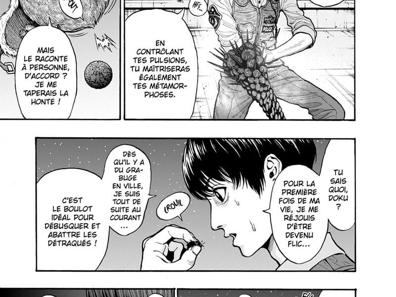 Après tout, la frontière entre un mutant et un détraqué (entre "bon" et "mauvais") est, comme nous le savons (ou devrions le savoir), plutôt instable. Et ce fait est souligné par deux personnages intéressants : Chiharu Matsuyamachi, un autre mutant raté qui se définit de façon ambiguë comme le rival de notre protagoniste ; et Motomu Robamata appelé "Roba", un Détraqué dont la genèse est décrite avec précision - suggérant un méchant important qui pourrait avoir (comme l'allié/rival Chiharu) un rôle futur récurrent. Roba est un "freeter", c'est-à-dire un jeune homme qui vit d'emplois occasionnels, sans avenir et consciemment affligé par son échec social. Ce fait l'amène à s'isoler, réduisant sa relation avec l'autre sexe à la pratique du voyeur, menée d'une manière aussi dégoûtante qu'élaborée (note : le fan-service n'apparaît pas du tout dans ce numéro). Et pour une existence marquée exclusivement par une amère résignation, laquelle est celle de Roba, quoi de plus dévastateur qu'un espoir déçu ? La possibilité de l'amour, qui à un certain moment semblera émerger, sera pour le malheureux garçon exclusivement l'origine - grenouille mise à part - de son "échec". Le design de Kensuke Nishida (I Am a Hero in Nagasaki ) est réaliste, détaillé et précis en anatomie et particulièrement attentif au design des monstres.