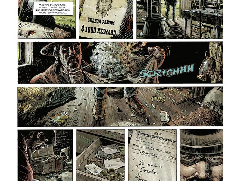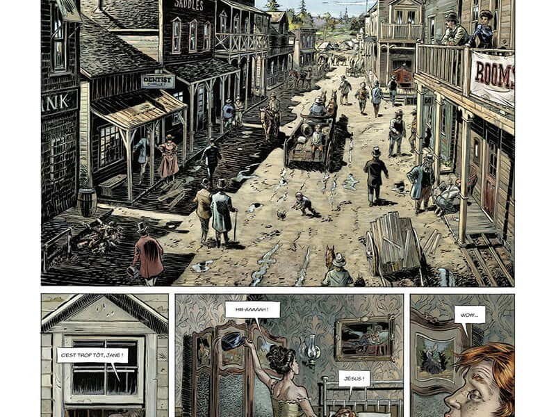 Le Far West regorge de personnages intéressants. Cependant, les faits et la fiction divergent souvent énormément. Ces dernières années, nous avons été amplement dotés de westerns fictifs avec des héros qui peuvent ou non être basés sur des classiques du monde du cinéma. Les choses sont complètement différentes avec Wild West. Nous suivons la vie d'une véritable légende, Martha Cannary, plus connue sous le nom de Calamity Jane. Pour notre jugement, nous pouvons rapidement aller droit au but. Il n'est pas facile de transformer des faits réels en un scénario tape-à-l'œil. Cependant, le scénariste Thierry Gloris a réussi à impliquer le lecteur dans la misère désespérée d'une jeune fille du Far West. Cette première partie traite des jeunes années moins connues de Calamity Jane. L'intention est, bien sûr, de construire progressivement le personnage et de nous donner une image dans la psyché de Martha et Bill Hickok. Mission accomplie. Les dessins de Jacques Lamontagne ne peuvent certainement pas être qualifiés de virtuoses, mais ils sont très atmosphériques (et oui, c'est une atmosphère grise). Quand on pense à Bill Hickok, on évoque la série Deadwood de HBO. Non seulement ce lieu sera toujours à l'honneur, mais la série télévisée mentionnée ci-dessus a donné un nouveau souffle au genre western et cela n'a pas échappé aux auteurs. Pour les amoureux de l'Ouest, c'est une réussite incontestable.