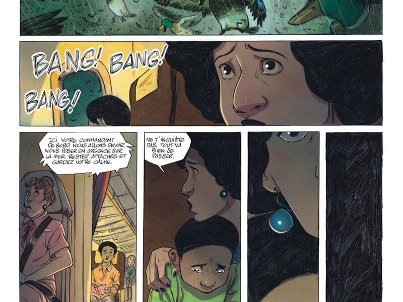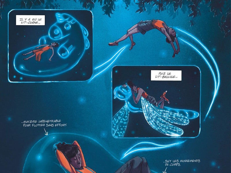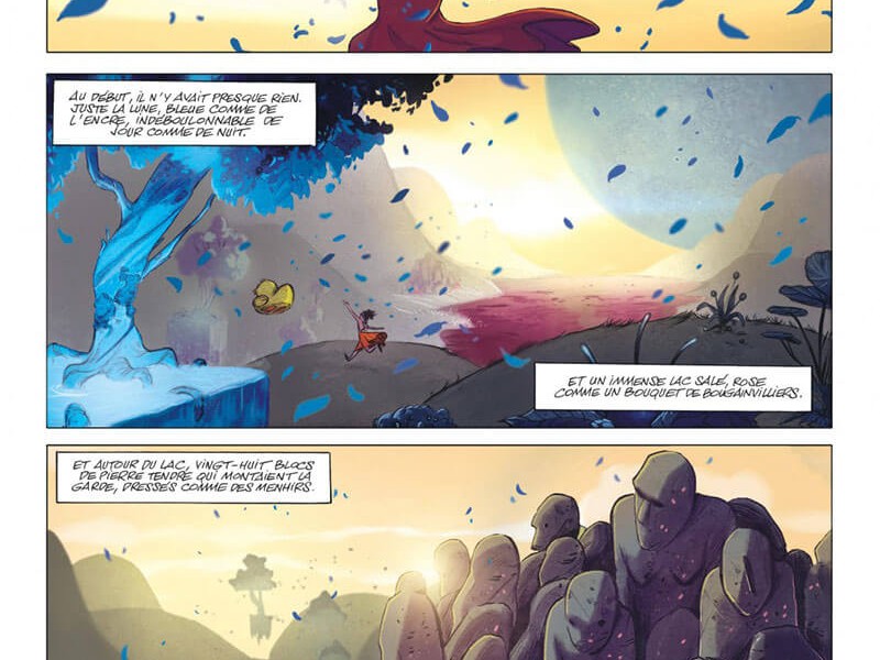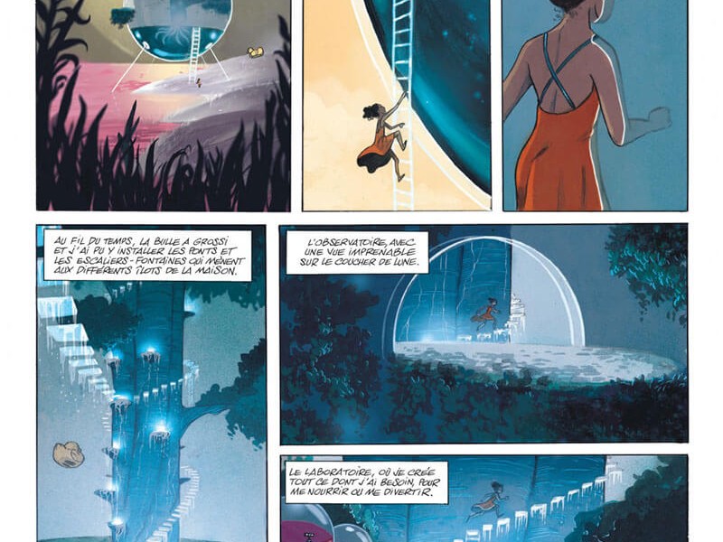Si l'histoire de Véronique Cazot parvient à se poursuivre sur le même rythme dans les quatre tomes prévus, avec la perspective réjouissante d'un final à la hauteur des attentes suscitées, le lecteur tout émoustillé d'avance mise sur un futur petit bijou. Car une jeune fille dépeinte comme constamment dans la Lune, réussissant à se projeter par un mécanisme inconnu, dans de réguliers allers et retours entre sa réalité ancrée dans la maladresse et un plan alternatif dans lequel un canard en plastique jaune au vocabulaire limité se flatte d'être son meilleur ami relève, sinon du kamoulox, d'un récit prometteur. Le lecteur perspicace se fait déjà son petit film. Il a noté la présence du chiffre 28 combinée à la Lune et à sa rondeur, elle-même associée à d'étranges animaux "astraux" filiformes, presque transparents de forme oblongue. Tout cela se déroulant dans un monde relativement protégé, paisible dans lequel prédomine du liquide. Si le pronostic du néo Hercule Poirot de la narration picturale s'avère juste, il faut bien avouer que ce serait une magnifique idée aussi maîtrisée qu'inédite, directement issue de l'imagination fertile de Véronique Cazot. Si en revanche l'hypothèse (brillante, forcément brillante) tombait en quenouille, le lecteur ne demanderait qu'à être encore plus surpris par la véritable fin. A la condition cependant qu'elle propose autre chose que l'évidente banalité de mondes parallèles interconnectés mis en danger l'un par l'autre (du genre de Narnia) Pour l'instant, ces pistes prometteuses en forme de purs moments de poésie doivent en (très) grande partie leur intérêt au somptueux dessin de Lucy Mazel. Empreintes de douceur, de délicatesse, ses couleurs apportent la finesse nécessaire à son habituel trait précis et fluide.