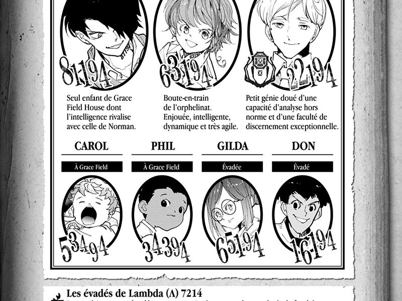 The Promised Neverland (Yakusoku no Neverland) est une série toujours en cours de parution au Japon et qui a connu vingt tomes aux éditions Shueisha. À Grace Field House, la vie ne pourrait pas être meilleure pour les orphelins ! Bien qu'ils n'aient pas de parents, avec les autres enfants et une gentille "Maman" qui s'occupe d'eux, ils forment une grande famille heureuse. Aucun enfant n'est jamais négligé, d'autant plus qu'ils ont tous été adoptés à l'âge de 12 ans. Leur quotidien est soumis à des tests rigoureux, mais ils sont ensuite autorisés à jouer à l'extérieur. Ils doivent obéir à une seule règle : ne pas quitter l'orphelinat. Mais un jour, Emma et Norman, deux des orphelins les mieux notés, s'aventurent derrière la porte et découvrent la réalité horrible qui les anime : ils sont tous du bétail et leur orphelinat est une ferme où est cultivé la nourriture pour une mystérieuse race de démons. Alors qu'il ne leur reste que quelques mois pour mettre en place un plan d'évacuation, les enfants doivent en quelque sorte changer leur destin. The Promised Neverland est une série plutôt unique dans un magazine comme le Weekly Shonen Jump. Bien sûr, il y a de jeunes protagonistes, de nombreuses scènes d'action et des éléments surnaturels qui abondent, mais il y a aussi un élément de thriller intense. Tout autant qu'un conflit a lieu mentalement comme physiquement.