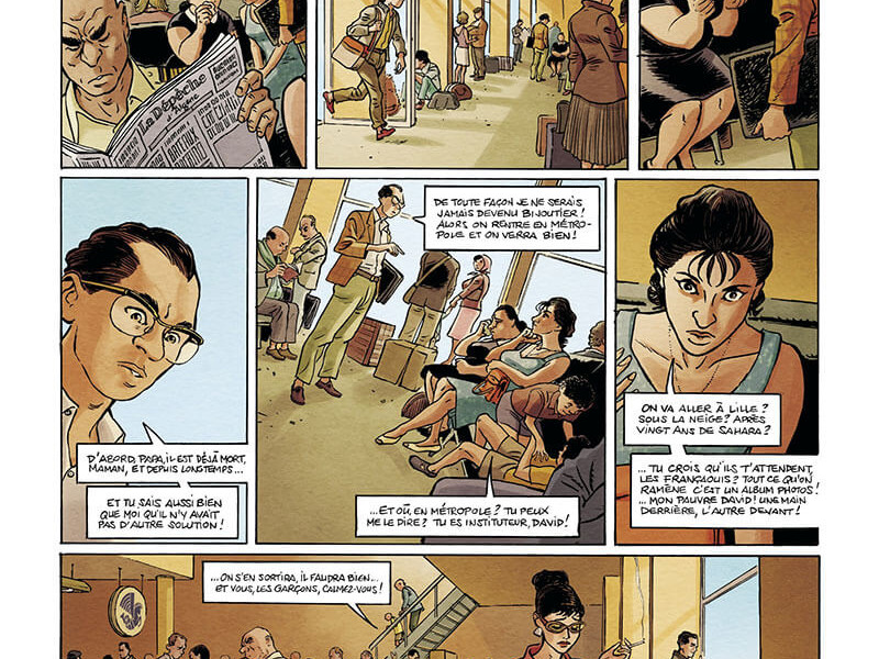 L'album sur scénario de Jean-Luc Truc est basé sur ses souvenirs d'enfance lorsque sa mère a effectivement fui l'Algérie avec tous les enfants en juillet 1962. À l'origine, son ami Patrick Jusseaume devait en faire le portrait, mais après une dizaine de pages de croquis, il est décédé le 25 octobre 2017. Olivier Mangin a pris le relais et a poursuivi le travail de dessin. Il est intéressant de pouvoir comparer les croquis de Jusseaume, au dos de l'album, avec les pages de Mangin. Il y a une similitude évidente en termes de conception et de délimitation, mais les dessins et les personnages de Jusseaume sont un peu plus vivants et ont plus de caractère, comme on peut également le voir dans la série Tramp qu'il a dessinée. Dans cet album, on nous présente brièvement un petit fragment d'histoire qui a pourtant troublé la France pendant des années, sous la présidence de Charles de Gaulle, à savoir la lutte pour l'indépendance de la colonie d'Algérie et les attaques de toutes sortes de l'OAS, y compris contre de Gaulle. Nous nous attendions à entendre un peu plus de détails sur la façon dont tout cela a pu se produire.
