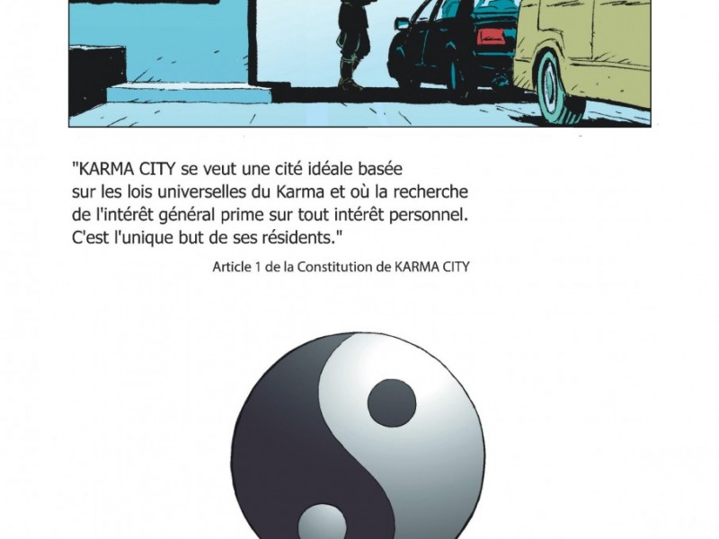 Karma City prend place dans une ville littéralement coupée en deux, avec la zone blanche ultra sécurisée, et une zone grise moins surveillée. Le yin et le yang dans toute sa splendeur. Et comme toute utopie, Karma City admet rapidement ses limites à plusieurs niveaux. L'équipe d'enquêteurs est vraiment très mal assortie et laisse présager des situations cocasses. Karma City joue sur des registres classiques, mais l'ouvrage s'avère très bien dessiné, évoluant dans un petit univers de grande ville côtière avec des personnages à l'allure ravagée. Le trait réaliste clair s'en sort à merveille. La trame monte crescendo, on amasse peu à peu les pièces d'un gigantesque complet qui pourrait emporter le monde tel qu'il existe à Karma City ...
