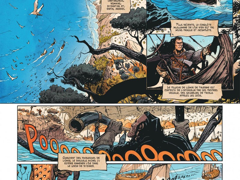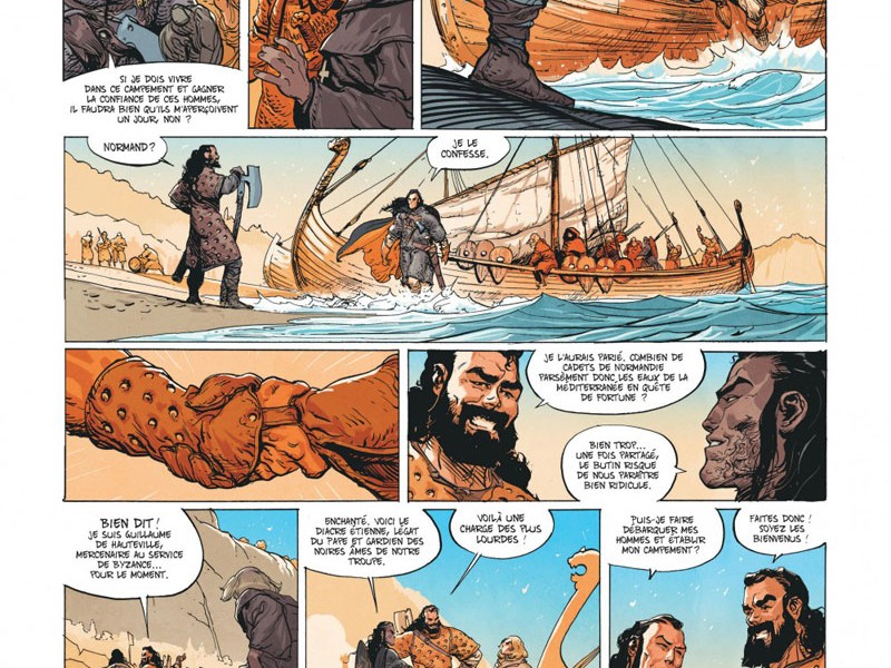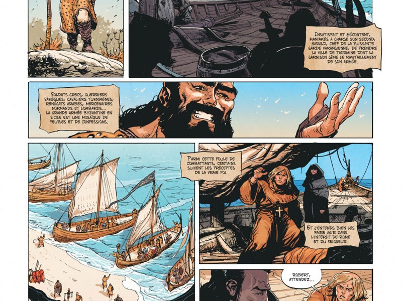 1040. Au cours de son histoire, la Sicile a subi le joug de nombreux maîtres (Grecs, Carthaginois, Romains, Byzantins et enfin Arabes). Cependant la conquête musulmane de l'île n'est pas totale et le pouvoir de l'émir de Palerme s'avère contesté de l'intérieur. Désireux d'exploiter ces faiblesses, le basileus Michel IV espère ramener la Sicile dans le giron de Byzance. L'Empereur a ordonné à son meilleur général, Maniakès, d'entamer la reconquête, mais après quelques succès, l'armée grecque piétine devant les murs de Syracuse. Maniakès confie à son second, Harald, chef de la puissante garde varangienne, de prendre la ville de Taormine. L'arrivée du normand Tancrède, accompagné du jeune moine Étienne, légat du pape, et d'une vingtaine de mercenaires, semble tomber à pic, surtout que cette petite troupe dit être en mesure de se débarrasser des Arabes pour de bon. De quoi attiser la curiosité d'Harald en tout cas, surtout que Tancrède lui propose un contrat : Faire tomber Taormine en trois jours, en échange de quoi il recevra les richesses de la cité. Arduin, l'émissaire du souverain Lombard, se méfie de Tancrède qui pourrait menacer sa place à la tête des mercenaires normands. Mais ce que tout le monde ignore encore, c'est que Tancrède revient de loin. Durant la dernière décennie, il était retenu comme esclave dans les mines de soufre de Synnada à Anatolikon, d'où il a réussi à s'enfuir. Le prêtre Étienne n'est pas sans part d'ombre non plus car l'or des caïds risque de lui faire tourner la tête ...