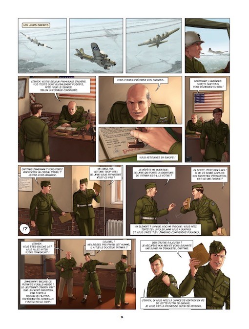 Ce deuxième album "Eagle, l'aigle à deux têtes" doit être lu parallèlement avec le tome 2 "Adler, l'aigle à deux têtes". Les deux couvertures côte-à-côte forment d'ailleurs un seul ensemble. Le scénario de cette partie nous permet de suivre l'histoire d'Eagle, enfin du moins de son enveloppe physique puisque son esprit semble désormais être possédé par celui de son homologue allemand. Le jeune homme présente un comportement imprévisible et violent, et peine à s'adapter à un monde qui n'est clairement pas le sien. Il décide de se rendre aux États-Unis pour essayer de comprendre ce qui se passe, mais à l'aube de l'année 1943, il se retrouve transféré en Afrique du Nord. Pour ne rien arranger, Eagle va croiser des connaissances d'Adler et se comporter comme s'il était un soldat allemand, tandis que les relations avec son père vont encore se distendre. Le scénario de Wallace réserve son lot d'interrogations, notamment concernant la dimension fantastique du récit, et il est parfois difficile de saisir l'importance des conversations. Le dessin de Julien Camp présente un style réaliste et plutôt détaillé qui n'est pas sans rappeler Romain Hugault (Angel Wings) offrant des séquences aériennes très dynamiques et un rendu global très réussi. Bien sur Eagle et Adler affichent les mêmes codes pour que les deux sagas conservent une unité.