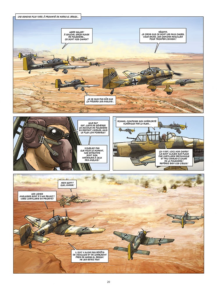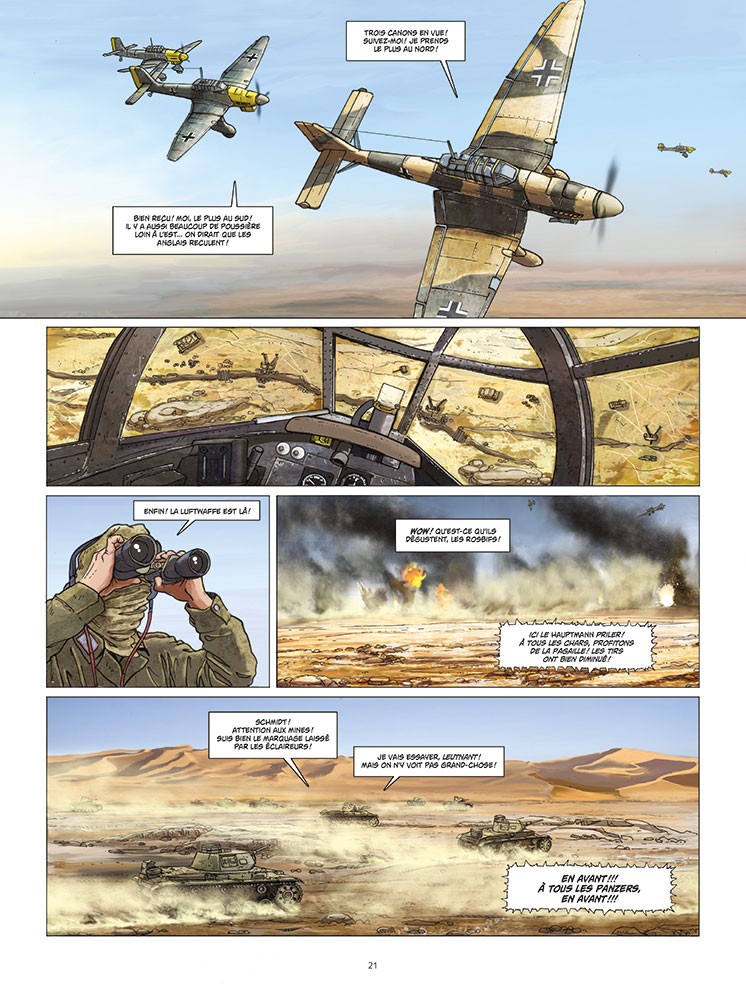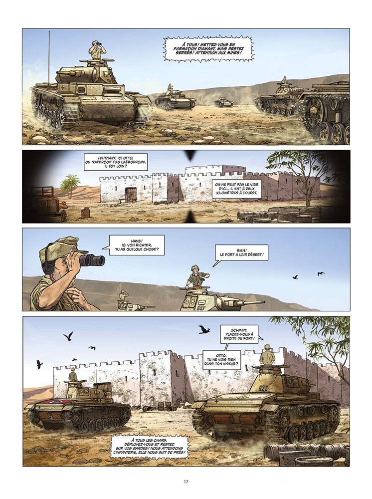 Après le front russe, le nouvel ouvrage d'Olivier Speltens prend toujours place durant la Seconde Guerre Mondiale, mais en Afrique cette fois. Il faut dire que les deux sont liés : Suite à l'opération Barberousse en janvier 1941 (Hitler voulait conquérir la Russie jusqu'à l’Oural et à la mer Caspienne), les troupes allemandes positionnées en Afrique du Nord n'étaient plus aussi bien approvisionnées en armes et en équipement, alors que les britanniques pouvaient jouir du port de Tobrouk pour se ravitailler. Ce premier tome de la série édité par Paquet nous présente le personnage principal, le lieutenant Joachim Von Richter, et nous plonge directement au cœur de la conquête de la ville. La rudesse de la région est particulièrement bien décrite et les batailles de chars s'avèrent spectaculaires. L'ouvrage s'appuie sur des faits réels, bien que le héros soit lui complètement fictif. Côté dessin, nous retrouvons le style habituel de l'auteur avec des planches d'une grande précision et une mise en couleurs élégante qui fait ressortir les difficultés d'évoluer dans un pareil décor.