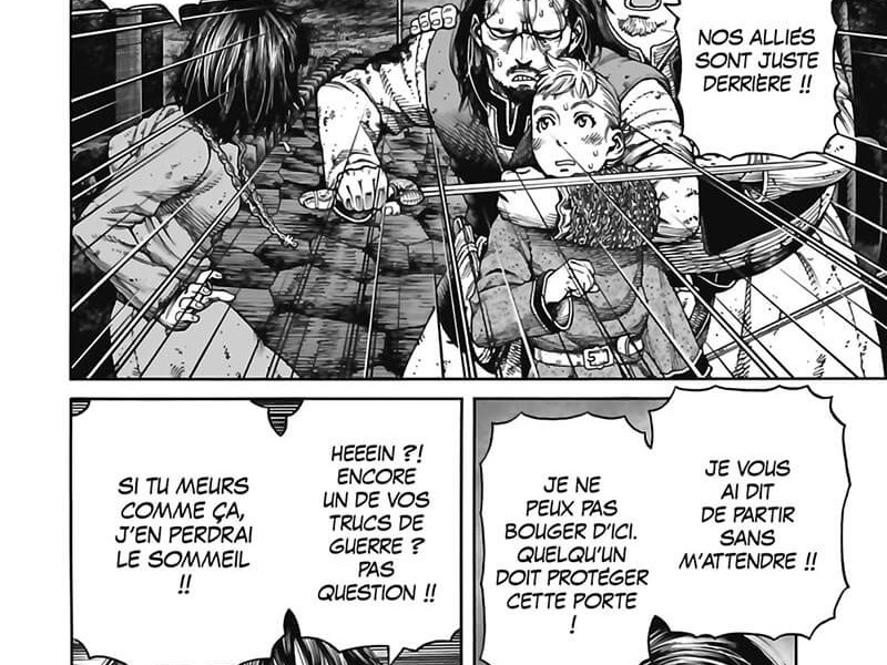 Depuis quelques temps, les armées de Thorkell et de Floki buttent sur la terrible forteresse de Jomsborg qui fait preuve d'une résistance à toute épreuve. Pourtant, Thorfinn a réussi à pénétrer à l'intérieur des lieux grâce à un passage secret dans le puits. Son objectif est de libérer Gudrid avec l'aide de Hild, mais il se retrouve face à Floki, le meurtrier de son père. Ce combat sera-t-il l'occasion pour Thorfinn de céder à ses pulsions, lui qui a tant changé depuis le début de la saga et qui avait renoncé de tuer ? Rien n'est moins sur, car ce duel au sommet est perturbé par l'arrivée de Garm dans la partie, bien décidé à affronter Thorfinn dans un combat à mort, sous le regard incrédule de Hild. Cela sera l'occasion pour l'auteur de développer la psyché du personnage dont le nom signifie "chien qui garde la porte des morts" et lui apporter un peu plus de profondeur, Garm étant jusqu'à présent présenté comme un puissant guerrier mais un peu creux. Quant à Sigurd, il entend jouer sa propre partition en prenant Baldur en otage, le fils de Floki, y voyant un moyen de pousser les Jomsvikings à ouvrir enfin les portes de la forteresse. Le dessin est toujours aussi réussi par sa part et affiche des décors d'une grande précision, ce qui explique en partie le rythme de parution assez lent de l'ouvrage. Makoto Yukimura introduit des éléments très intéressants dans le dernière partie et sait surprendre le lecteur quand il le faut. L'arc étant terminé, les principaux protagonistes vont se séparer à nouveau alors que le monde viking retrouve enfin la paix.