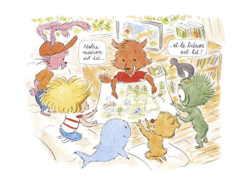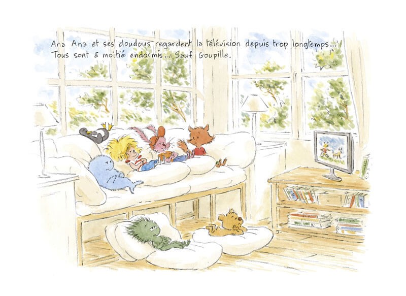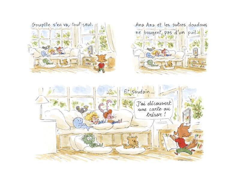 Affalés devant la télévision, Ana Ana et ses doudous n’ont pas envie de suivre Goupille à l’extérieur même s’il fait un plein soleil. Mais quand le renard leur annonce qu’il a trouvé une carte au trésor, alors tous sortent en courant, emportant avec eux les instruments essentiels à leur activité. En chemin, ils traversent un pré, suivent le cours d’un ruisseau, marchent dans une plaine… et si le véritable trésor était la balade ?