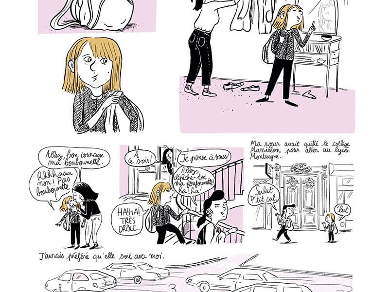 "L’excitation à l’approche de l'entrée au collège, cette attente fébrile, cette fierté d’être enfin grand, cette douce angoisse qui tord le ventre… mais quand cela tourne au tord-boyaux, c’est tout de suite moins folichon. Et ce n’est pas Magali qui dira le contraire. Ce petit brin d'énergie, plein de bonne volonté et attachant comme tout, commence à s'étioler. Elle dort mal, étudie mal et vit mal. "Phobie scolaire", on pose des mots sur ces maux. Mais pour combattre le cafard, c’est à grand renfort de « scarabées » qu’elle le fera. Et tandis qu'elle déchantait, c'est en chantant qu'elle s'épanouit à nouveau. Elle nous entraîne alors dans son quotidien naïf, drôle et touchant à la fois (on y retrouve un petit côté "Cahiers d"Esther"), qu’elle égaye de magnifiques pleines pages, libératoires et acidulées. Magali Le Huche en a fait une bande dessinée que l’on ne peut qu’aimer, adorer, garder précieusement pour soi. Et lire cela sous le graphisme, les illustrations de Magali Le Huche est d’une générosité, douceur, délicatesse belle, haut en couleurs et irrésistible. Les traits donnent envie de se replonger avec tendresse dans nos années têtes de bois et cœur en chamade, cette période un peu révoltée et à la fois très réconfortante de la préadolescence et des découvertes des premières lectures. Les personnages ont chacun leur caractère, leurs traits.