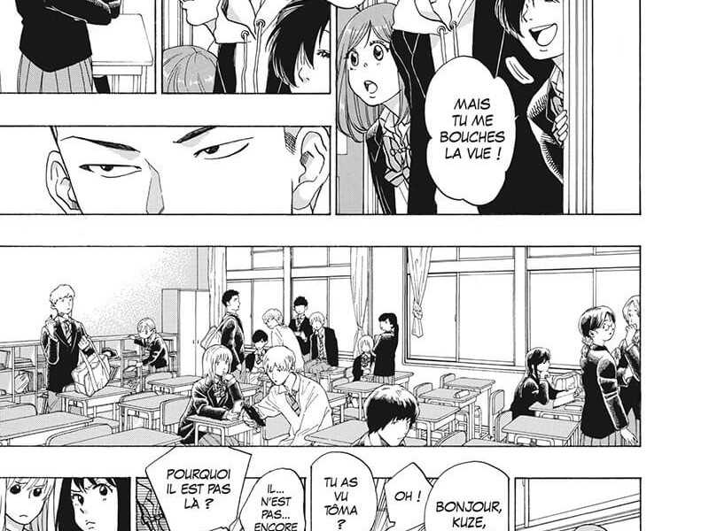 Blue Flag (Ao no Flag) est un manga conclu en huit tomes au Japon aux éditions Shueisha. Il faut noter que cet ouvrage a d'abord été publié sous forme numérique sur l'application Shueisha Jump + avant de sortir en volume relié. L'histoire du premier amour commence lorsque trois lycéens se rencontrent au cours de leur année de terminale. Tous les trois ont également peur de ce que la vie pourrait leur réserver après l'école. C'est ainsi que Taichi Ichinose est censé aider sa camarade de classe Futaba Kuze à se préparer pour un rendez-vous, et pourtant il a du mal à la supporter. Ce "date" est prévu avec son meilleur ami qui par ailleurs le garçon le plus populaire de l'école, Tôma Mita. Le premier problème ne se fait pas attendre, car si Taichi accepte effectivement d'aider l'adolescente, il développe rapidement des sentiments contradictoires en son encontre ... au point de la trouver craquante (est-il tombé amoureux ?). Problème numéro deux : Tôma est lui bel et bien secrètement amoureux de Taichi depuis toujours. Les personnages principaux et les lecteurs peuvent s'attendre à des journées de printemps agréables, difficiles et déchirantes. L'histoire elle-même commence assez lentement et se développe par petites étapes en une trame vraiment belle qui pourrait laisser penser que nous sommes dans un shojo et pourtant Blue Flag est bien un shonen. Et bientôt un quadrangle amoureux inattendu avec un soupçon d'amour non partagé émerge. L'amour est déjà assez difficile, mais il devient un labyrinthe infranchissable pour le lycéen discret Taichi Ichinose et sa timide camarade Futaba Kuze ...