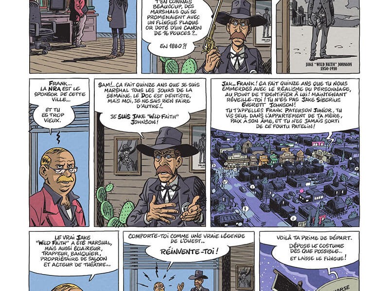 Il s'appelle Jake Johnson. C'est une légende de l'Ouest... au chômage. Depuis 15 ans, Frank incarne le célèbre Marshal Johnson dans le spectacle quotidien de Woodstone. Il est totalement possédé par son personnage. Un peu trop, de l'avis du psychiatre, surtout depuis que Frank a tiré sur un touriste. A l'aune de ses 40 ans, officiellement jugé « trop vieux » pour le rôle, Frank perd tout. Son seul horizon : un voyage organisé dans l’Ouest, offert par ses collègues qui sera l’occasion pour lui de réécrire la légende. L'occasion pour notre cow-boy de briller par son érudition historique, mais aussi de remettre toute sa vie en question en côtoyant ses contemporains. Un beau voyage dans l’ouest américain rempli de doute, d’insouciance, d’obstination, d'une pointe de schizophrénie ... et bien sur d'un Colt modèle 1880. On est jamais trop prudent ...