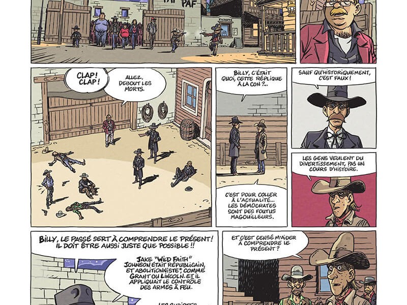 La colère est le sentiment qui accompagne le personnage principal pendant toute l’œuvre. Il est révolté contre la légende de l’Ouest, sa manipulation par rapport à la réalité historique. Il enrage contre la naïveté et l’ignorance du touriste moyen. Bruno Duhamel réutilisé ici les codes du western pour mieux les critiquer. En effet, nous ne pouvons pas ignorer les répercussions de l’instrumentalisation de l’Histoire de l’Ouest dans la bande dessinée sur notre perception de cette période. Cet album, bien que moins divertissant qu’un western classique nous fait beaucoup de bien. Il nous rappelle qu’au-delà la fiction, des évènements historiques complexes ont eu lieu dans l’Ouest américain et qu’il est important de ne pas les oublier.