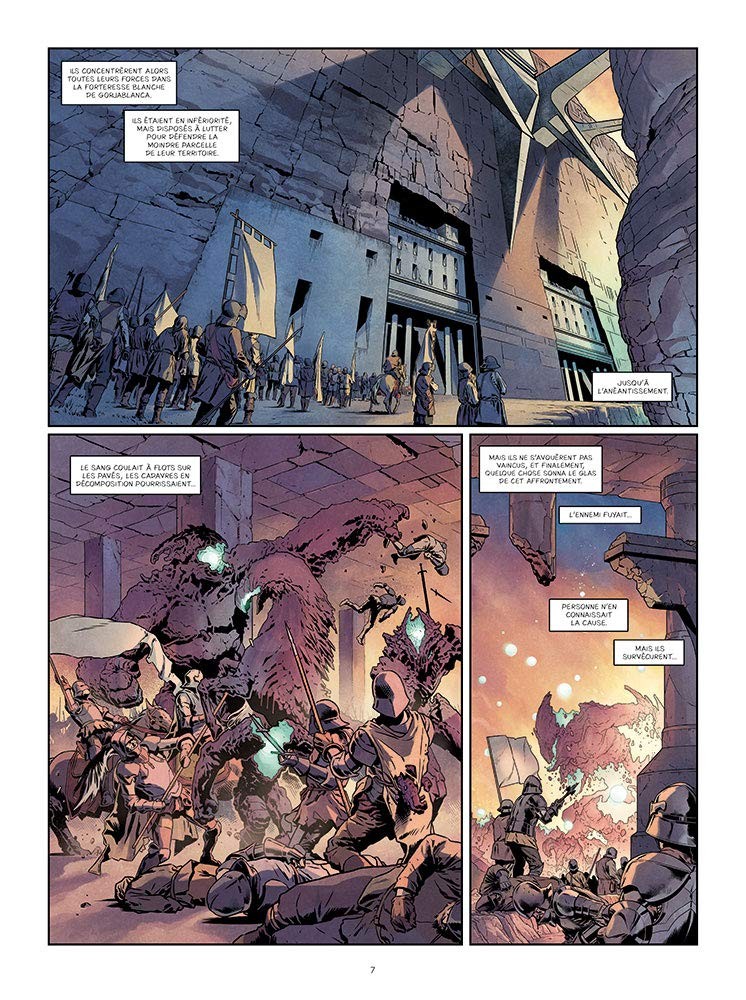 La conquête d'un pays, où se construisent quelques villes qui - peu de temps après - se font à nouveau la guerre, est un préambule très mystérieux qui vous accroche immédiatement en tant que lecteur. Surtout quand un roi émerge et renonce à à son vrai leadership. Il propose une alliance selon laquelle ce n'est pas lui, mais sa fille et le fils d'un adversaire vaincu qui doivent assurer la paix. Le roi Noir, comme on l'appelle, disparaît de l'histoire et les habitants du royaume doivent attendre que les deux enfants soient adultes et accomplissent leurs promesses de mariage. D'ici là, la paix est maintenue par la Garde Blanche, qui doit faire face à toute sorte d'opposition et est régulièrement envoyée sur le terrain pour réprimer toute menace. Lorsque la Garde Blanche reçoit l'ordre d'entrer dans la zone marécageuse, après la disparition de plusieurs messagers, Bernat de Cos et son corps d'élite expérimenté sont en première ligne face à un danger protéiforme. La véritable histoire du duo Sergio Sandoval et Gonzalo Torné de la Guardia débute alors. Ils racontent leur intrigue à travers Igor le fou qui effectue sa première mission avec la Garde Blanche. Derrière chaque arbre ou chaque pierre se cache l'inconnu. Ce qu'ils finissent par découvrir dans les marécages fournit suffisamment de matière pour qu'ils puissent travailler dans les parties suivantes.
