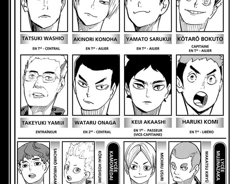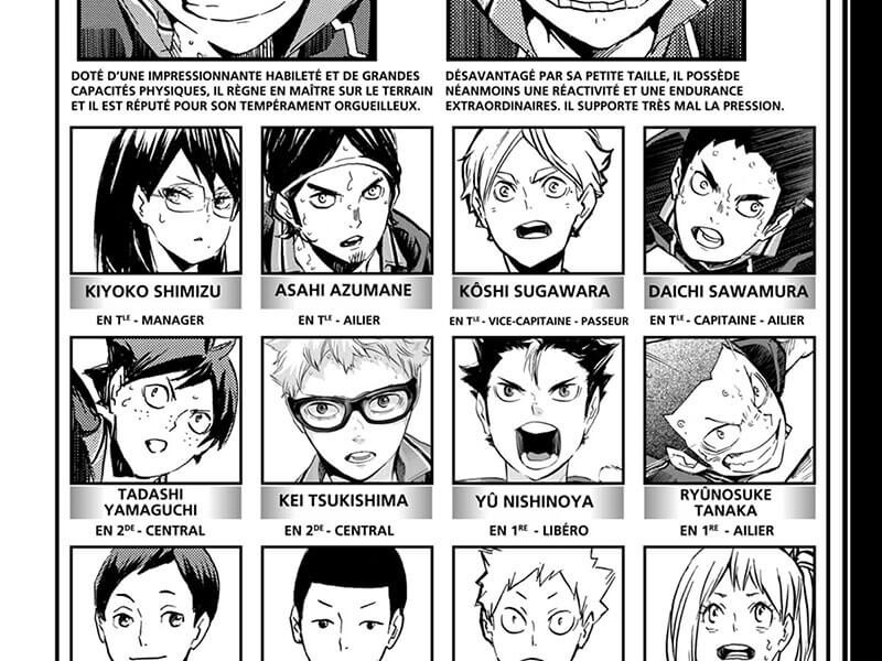 Haikyu !! Les As du volley (Haikyu !!) est une série toujours en cours de parution au Japon et qui a connu quarante-trois tomes à ce jour aux éditions Shueisha. Après avoir perdu son premier et dernier match de volley-ball contre Tobio Kageyama, «le roi de la cour», Shoyo Hinata jure de devenir son rival après avoir obtenu son diplôme de collège. Mais que se passe-t-il quand le gars qu'il veut vaincre finit par être son coéquipier au lycée Karasuno ?! Malgré son pauvre mètre 63, Shôyô se donne à fond dans le sport qu'il aime. Son secret pour compenser sa petite taille : une détente phénoménale. Les deux recrues devront jouer en combinaison pour espérer redorer le blason du club, déchu de son rang de champion...