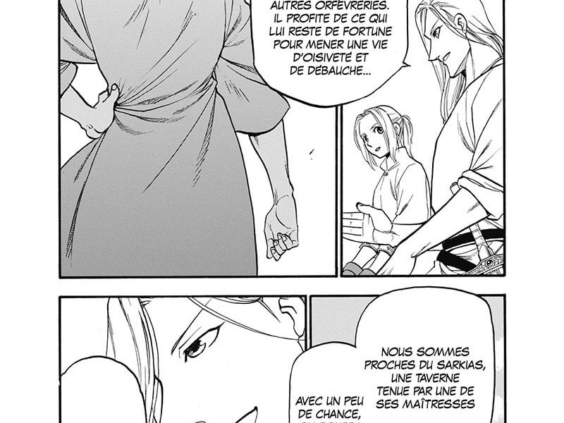 Bien que le personnage de la couverture soit l'empereur des Lusitaniens, le contenu du manga parle de quelque chose de complètement différent, en fait nous continuons là où nous nous sommes arrêtés et atterrissons dans la partie sud du royaume, précisément dans le ville prospère de Gilan. Ici, Arslan et son entourage comprennent à quel point la situation sur le continent importe peu à cette ville balnéaire, qui continue sa vie comme toujours, faisant des affaires et se remplissant d'argent. Une situation qui pourrait donc s'avérer épineuse, mais Narsus identifie quelques points cruciaux qu'il peut exploiter afin de retourner sa situation à son avantage, et ce malgré le soutien convoité d'un vieil ami à lui n'est pas évident. Ce tome ouvre un nouvel arc du périple d’Arslan pour reconquérir son pays et reprendre la couronne. Un tome plutôt calme comparé aux deux derniers qui avaient été plein de rebondissements pour la quête principale. Néanmoins c’est une pause bienvenue après tant de changements. Arslan et ses amis nous font découvrir une nouvelle ville et ça nous avait manqué de partir en voyage avec eux. Les combats sont au rendez-vous tout comme les intrigues de palais. Arslan assiste à sa première bataille maritime d’ailleurs, notre petit prince a développé un sens de la justice appréciable. Narsus est toujours un aussi bon stratège qui ne se laisse pas perturber ou encore rouler dans la farine. De plus, les pointes d’humour présentes dans ce tome nous ont bien fait rire. La découverte de nouveaux personnages fait également très plaisir.