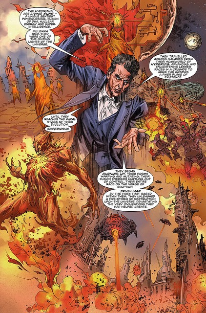 Pour rappel, est une série britannique de science-fiction créée par Sydney Newman et Donald Wilson et diffusée initialement de 1963 à 1989 sur BBC One. Elle raconte les aventures d'un extra-terrestre d'apparence humaine, le Docteur, qui voyage dans l'espace-temps à bord d'un vaisseau spatial, le TARDIS. Lorsque le Docteur est mortellement blessé, il peut survivre en se régénérant ; il change alors d'apparence et dans une certaine mesure, de personnalité. Après 26 saisons, la BBC annula la série à cause d'une baisse d'audience et d'intérêt du public. La seconde série, diffusée depuis 2005, correspond à une suite de la première série et compte déjà 10 nouvelles saisons, avec une diffusion dans de nombreux pays dont la France. Comme le titre l'indique, ce comics est quant à lui centré autour du Douzième Docteur, incarné à l'écran par Peter Capaldi. Ce comics débute alors que le Docteur vient juste de se régénérer et met donc à nouveau en scène Clara Oswald (Jenna Coleman) alias la fille impossible, comme compagne de route. Ce troisième volume débute par un mini-récit au cœur de l'Angleterre victorienne, où un alien isolé manipule les humains grâce aux ondes psychiques. Le retour à l'ère moderne se fera dans la douleur car le Tardis atterrit dans un Londres post-apocalyptique. Le Docteur se serait-il trompé de destination ? Eh bien non, mais le monde a beaucoup changé durant son absence. Clara est la première à le découvrir, cette dernière étant attaquée par un écorché, un humain qui a été brûlé par les flammes mais qui s'est relevé ensuite. Elle sera heureusement secouru par Sam le pompier (!), mais pas celui auquel on pensait. Le responsable de tous ces malheurs sur Terre ne sont autres que les Hyperions, une race de soleils vivants autrefois éclairée (spirituellement) et qui a apporté le progrès sur de nombreuses planètes. Mais après avoir atteint l'ultime stage de leur évolution, la Supernova, les aliens ont beaucoup changé et ont littéralement mis le feu à tout l'univers jusqu'à ce que les Seigneurs du Temps mettent fin à leur règne de terreur. La Terre risque d'être la prochaine victime, sauf si le Docteur parvient à contrer la menace ... avec un armement forcément venu d'ailleurs.