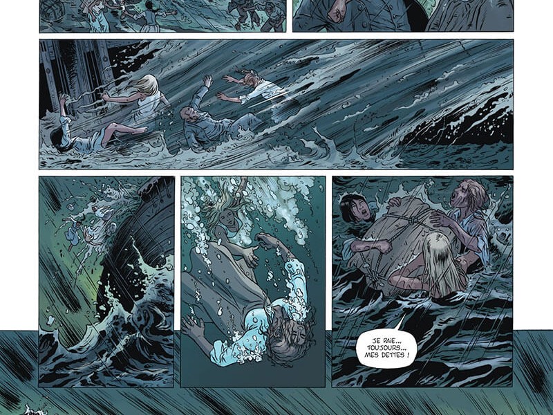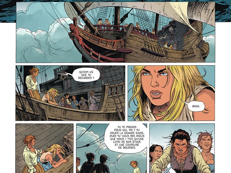 Piatzszek aborde ici un aspect peu exploité en BD de la colonisation et de la flibuste : la vie sur place de ces femmes prisonnières en métropole qui furent raflées dans les geôles pour être envoyées à l'autre bout du monde afin d'ancrer artificiellement des colonies durables outremer. Filles de joie ou de mauvaise vie, criminelles ou simples contrevenantes à la morale de l'époque, elles furent embarquées de force pour grossir les rangs des nations dans les Antilles ou ailleurs. L'auteur brode là dessus pour imaginer trois femmes stéréotypiques concatenant les divers malheurs qu'ont eu à subir ces pauvresses. TieKo met tout ça en images de fort belle manière avec les couleurs de Fabien Blanchot. Vu l'histoire, on est sur des planches qui font la part belle aux personnages mais l'artiste ne se prive pas de quelques superbes vues larges de la baie et ses galions. Une Promesse de la Tortue qui promet de faire une belle trilogie pleine d'aventures mais surtout remplie de destins féminins forts et poignants.