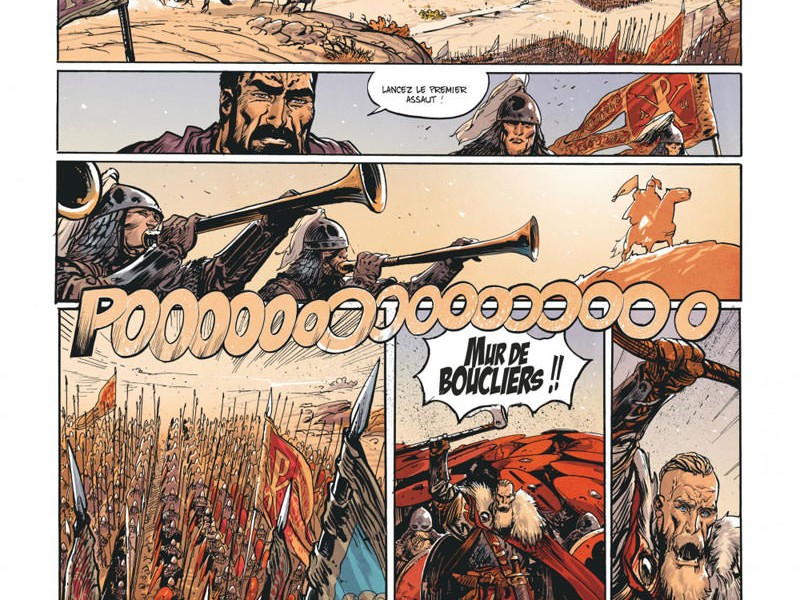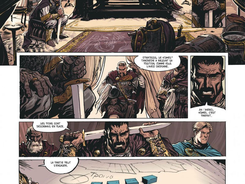 Le duo Vincent Brugeas/Ronan Toulhoat (Le Roy des Ribauds, Block 109, etc) se reconstitue à l'occasion d'une série historique. Beaucoup de questions nous interpellent sur le réel but que poursuit Tancrède dans cette mission menée par l'Église. La mise en place des événements s'avère très efficace et le récit débute en force avec un groupe de mercenaires qui fait rapidement parler les muscles. La structure en analepse intègre de longs passages nous relatant les préparatifs de la bataille, une préparation que ne renierait pas les stratèges de Game of Thrones avec de nombreux coups bas à tous les étages. Le "héros" de cet opus est cette fois le diacre Étienne, enfermé dans une cage, qui distille des réflexions très intéressants sur le monde actuel, alors que la bataille entre byzantins et maures est déjà dans tous les esprits. Le passé de Tancrède reste encore des plus mystérieux dans ce tome, le scénariste Vincent Brugeas dévoilant avec parcimonie les informations nécessaires pour comprendre les agissements du personnage. Les dessins de Ronan Toulhoat sont parfaitement à l'unisson, offrant des personnages riches en nuances, des décors prodigieux et une mise en scène très harmonieuse. Du côté des couleurs, la tonalité évolue selon la période visitée : façon sépia dans le passé, vives à l'époque présente, et sanglantes dans les scènes d'action.
