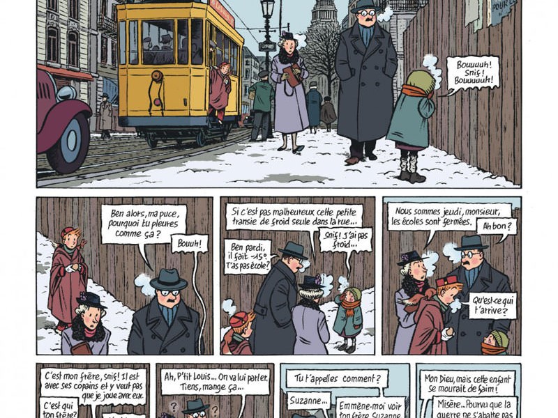 Bien sûr, le changement ne sera jamais complet. Spirou est trop bienveillant pour être cynique : il ne renoncera jamais à aider les autres, qu'il s'agisse d'enfants des rues ou de Fantasio, qui continue à avoir des ennuis à poursuivre l'objectif de devenir journaliste et de ne jamais cesser d'être du côté des faibles. Son amour pour la fille lointaine est absolu et platonique comme seul un adolescent romantique peut l’être. Le livre oscille alors entre doux et amer, entre des moments dramatiques qui se fondent dans la farce et des situations qu’une tome de Spirou "normal" aurait résolues d'une manière des plus classiques, mais qui ici entraînerait la mort d’un personnage. Malgré les nombreux gags que Bravo insère dans l'intrigue, l'ombre de la guerre est magnifiée page par page , ce qui confère à l'ouvrage une étrange saveur - très réaliste en réalité - d'angoisse et de légèreté à la fois. Pour que ce sentiment soit encore plus fort, l'auteur s'attache exclusivement aux personnages belges et à leurs alliés . les Allemands qui apparaissent dans la bande dessinée ne sont guère plus que des ombres, des hommes noirs défilant dans les rues et menaçant la population, aussi terribles que soient les récits inventés et exagérés que les enfants racontent à leur sujet. Il semble très clair de quel côté se trouve le dessinateur et avec lui Spirou; la représentation du conflit serait presque manichéenne, bien contre le mal, s’il n’y avait pas de précisions pour saper cette certitude, comme par exemple la déportation de civils allemands par les "bons" ou un geste de générosité ou de respect par les "méchants", qu'ils soient les envahisseurs ou les collaborateurs.