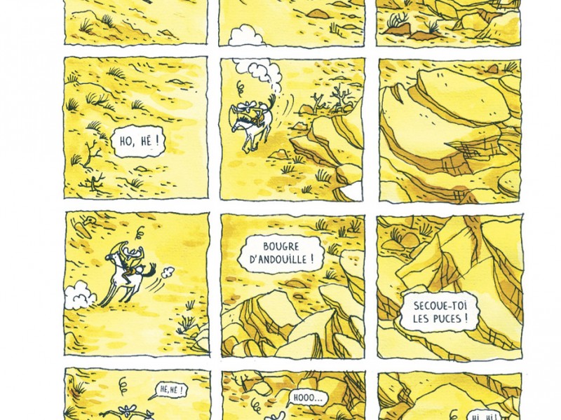 Calfboy est un album réjouissant, rempli de bonnes idées graphiques. Plusieurs planches divisées en gaufrier illustrent en pleines pages des scènes dynamiques où l’on voit les protagonistes évoluer dans le décor afin de créer une impression de mouvements. Le dessin simple et l’humour brillant de Farnos me rappellent l’univers de Tom Gauld. Les dialogues savoureux rythment ce « road trip » à cheval complètement décalé et mené à un train d’enfer.