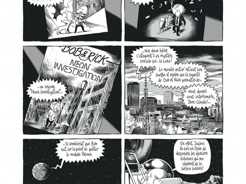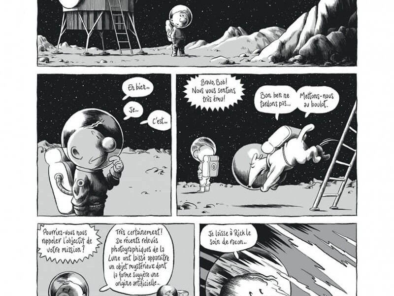 Le journaliste vedette Bob et son chien Rick sont célèbres dans le monde entier pour leurs nombreuses aventures. Alors qu’ils sont sur la lune afin d’éclaircir un nouveau mystère, Bob assiste à la mort tragique de son fidèle ami qui suffoque lorsque son casque d’astronaute éclate à la suite du choc d’une météorite. Plus tard, Bob dépressif qui a fait empailler son chien et l’a déposé sur le manteau de la cheminée, plonge dans une apathie chronique qui lui fait sans relâche feuilleter les albums de ses aventures qu’il a partagées avec Rick. Bob s’encroute dans un quotidien morne, jusqu’au jour où Rick n’en pouvant plus de voir son copain dans cet état l’interpelle du haut de sa tablette et le met sur la piste d’une nouvelle enquête ayant pour but d’éclairer les mystères du monde quantique. Ces premières pages donnent le ton à cette bande dessinée enrobée d’un emballage humoristique et déjanté afin de nous faire avaler un contenu dense et abstrait.