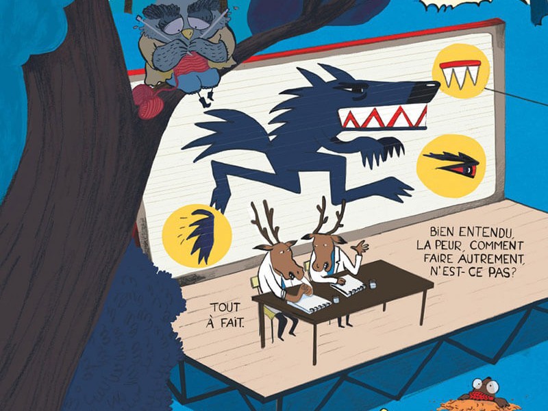 Le loup terrorise la forêt et ses habitants qui vivent continuellement dans la peur de se faire croquer les fesses. Alors pour combattre l’animal aux yeux perçants et aux dents acérées, les habitants de la forêt se regroupent. Des alertes « enlèvements » sont affichées sur les troncs pour aviser et mettre en garde la population. Des alarmes, des pièges anti-loups, des clôtures barbelées sont proposés afin de sécuriser son chez-soi grâce à des appareils ultra-performants et dernier cri qui, suivant le son choisi, transmettent au propriétaire un bruit de cloche ou de réveil strident prêt à faire fuir le moindre voleur rabatteur de petits-enfants. Les gazettes n’hésitent pas à faire de leurs unes, des articles anxiogènes ou reculs et analyses ne sont pas souverains. Dans les clubs de sports et de coachings, tout est fait pour apprendre à parer aux agressions du loup : cours de karaté, parade juridique, lectures autour de l’animal et même l’écureuil du coin qui promet à coup de saucissons, de chips, de cakes et de noisettes de vaincre cet être noir et sanguinaire. Quant aux cerfs politiques et autres analystes psycho-socio-théologiques, ils s’en donnent à cornes- joie, professant des vérités absolument terrifiantes : « alors le loup n’est ce pas ? Ses crocs comme des pioches, son regard fou. Son pelage hirsute. Bouuuuh ! LA PEUR ! Bien entendu la peur, comment faire autrement n’est-ce pas ? » Bref le loup, cet animal assoiffé de sang et de chairs fraiches que les brigades anti-loup surveillent, prêtes à intervenir à la moindre embuscade terrorisante. Alors quand le loup descend de sa colline et pointe son bout du nez dans la clairière, les horribles crocs prêts à dévorer le plus petit blaireau, le moindre sanglier ou oiselet, c’est l’effervescence, genoux mous, tout mous. Les portes claquent, les terriers se terrent, les arbustes deviennent des refuges et les brigades tremblent. Planquez-vous le loup arrive… Oui mais en slip !!!!