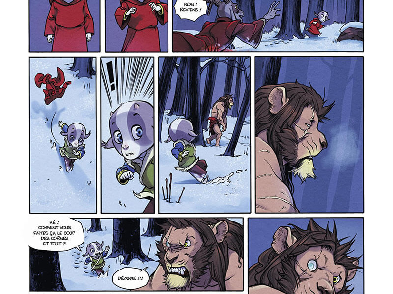 Tiens, encore un nouvel album des 5 Terres, c'est ce que le lecteur pourrait se dire en voyant cette BD chez son libraire : Un monde animalier, un lion barbare, beaucoup de violence. Serait-ce un spin-off peut-être ? Eh ben non. L'Ogre Lion est bien une œuvre singulière. Et de bonne qualité de plus. On suit les aventures de Kgosi, un homme-lion éloigné loin de ses terres et qui est atteint de pertes de mémoire pour des raisons inconnues. Wilt a quant à lui été élevé par les adorateurs du démon Bakham Tyholi, un esprit vengeur qui ne supporte pas l'injustice du monde actuel mais est obligé de se réincarner régulièrement. Quel est son lien avec le lion Kgosi ? C'est ce que l'on découvrira dans ce premier épisode. Bien sûr nos deux compères vont prendre la route ensemble, chacun cherchant à rentrer chez lui. Mais méfiez vous des apparences, les plus forts ne sont pas ceux qu'on imagine dans cet album surprenant ! La galerie de personnages (nombreux mais limpides) est géniale, intelligente et originale, ce qui n'est pas évident tant la comparaison avec Les 5 terres et autres Roi Ours va forcément se faire ! C'est bien écrit, sans aucun ralentissement, et toutes les scènes sont jouissives, que ce soit de combat, de dialogue ou d'humour ! Ce premier tome expose parfaitement la tension, les enjeux et les poids liés à chacun des protagonistes principaux. Le dessin, plus funky que ses pairs est absolument parfait dans le thème et colle au ton du récit qui nous a complètement attrapé et se révèle par moment très drôle. Attention, pas de méprise, le scénario est prenant et ne se perd pas en surenchère comique feinte ! Tout est pesé, pensé, à l'équilibre entre drame, mystère, humour, action, complot et hémoglobine. Il est évident que de la souris cardiaque, de la chauve-souris toxico et de la chèvre manipulatrice, ce n'est pas habituel, même dans la bande dessinée.
