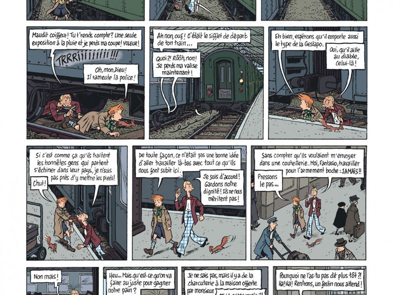 Voici la deuxième partie d'une œuvre monumentale, une tétralogie emmenant Spirou et Fantasio durant la Seconde Guerre Mondiale. A la fin du premier album, nous voyons Fantasio prendre le train pour l'Allemagne. Ses articles sont-ils si populaires auprès de la rédaction germanophone du Soir qu'il obtient une promotion ? Spirou réussit finalement à l'arrêter juste à temps. Nos deux amis ne peuvent pas non plus échapper à la dure réalité : Spirou s'en tient à ses principes solides, mais il doit y avoir du pain sur l'étagère et comment devrait-il payer son loyer ? De plus, Kassandra ne cesse de hanter sa tête. Dans un monde où le bien et le mal se confondent, nos amis essaient de choisir le bon chemin. En restant eux-mêmes, ils jouent un rôle important dans la lutte et, pour beaucoup, ils deviennent littéralement un espoir en ses temps effrayés. Pendant cent quatre-vingts pages, Emile Bravo nous emmène en Belgique et à Bruxelles au début des années 1940 et, d'une manière correcte et innocente, il évoque peu à peu la dure réalité. Les scènes de la vie quotidienne (comme les enfants qui jouent, les files d'attente à l'épicerie avec les opinions de plus en plus extrêmes de la communauté ou les visites ordinaires à la terrasse et au café) sont naturellement mêlées à des questions émotionnelles (comme l'amitié avec le couple juif Felix et Felka ou bien le sort des enfants dont les parents sont arrêtés pour sympathie communiste) et la dure réalité de la guerre (les Allemands menaçant dans la rue et l'apparition des étoiles jaunes sur les juifs). Heureusement, l'humour n'est pas oublié dans tout cela. Fantasio est magistral comme irrésistible impulsif enfantin, ne cherchant pas plus loin que le bout de son nez et qui apporte de la tension dans de nombreuses scènes. Dans cette partie, Spirou et Fantasio, en tant que comédiens de théâtre de marionnettes accomplis, traversent la Belgique et s'impliquent de plus en plus dans la résistance.