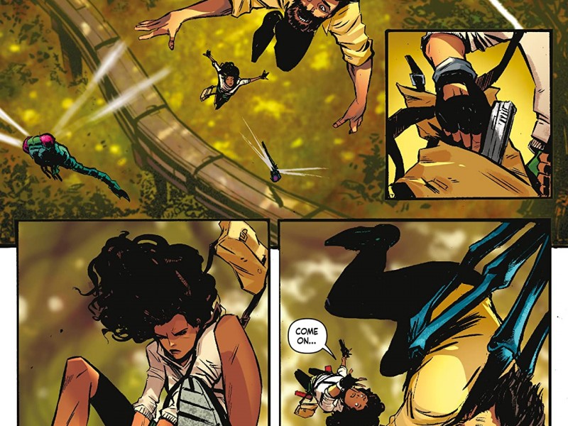 Skyward Vol. 2 reprend bon nombre des points positifs du premier volume tout en parvenant à faire avancer l'intrigue de manière intéressante. Il met en scène une charmante distribution de personnages qui sont obligés de sauter d'une situation tendue à l'autre. En cours de route, les lecteurs en apprennent encore plus sur l'univers incroyablement captivant de cette bande dessinée et peuvent également voir le récit plus vaste de la série se développer encore davantage. Toutes les parties de l'histoire ne sont pas géniales, mais les aspects positifs l'emportent nettement sur les aspects négatifs. En fin de compte, cela contribue à faire de cette BD une autre entrée solide dans une série intéressante. La majorité de l'histoire de "Here There Be Dragonflies" est assez solide. Elle met les personnages principaux en danger dès le début et leur fait surmonter héroïquement ce danger au fur et à mesure que le comics se poursuit. Ils doivent se battre pour leur vie contre une horde d'insectes géants et un groupe de personnes au bout du rouleau, ce qui est tendu et divertissant. De plus, pendant que tout cela se déroule, la quête de Willa pour rétablir la gravité devient lentement plus importante et plus tangible, ce qui contribue à susciter un intérêt supplémentaire pour le prochain volume. Les seuls endroits où l'histoire trébuche sont les parties axées sur le triangle amoureux terne de la bande dessinée. La relation entre Willa et Edison est si peu développée que le fait qu'elle s'intéresse à une autre personne ne semble pas aussi important que le veut le récit. De plus, la relation entre Willa et Lucas commence et se termine si rapidement qu'elle finit par ressembler plus à une distraction qu'à toute autre chose. Heureusement, le triangle amoureux n'est que l'un des nombreux thèmes abordés dans ce livre, ce qui n'alourdit pas trop le récit.