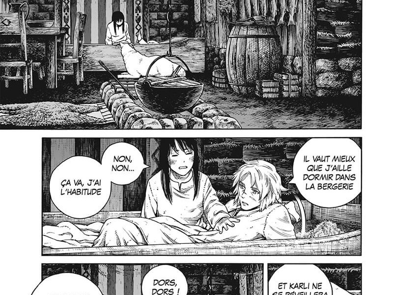 Après avoir passé son enfance à tenter de venger son père et son adolescence à servir d'esclave dans une ferme, Thorfinn cherche des ressources pour rendre possible le long voyage vers le Vinland, mais il se retrouve mêlé à une dispute pour le leadership du Jomsviking, le plus puissant groupe de guerriers de la mer du Nord, transformant Jomsborg et la mer Baltique en champ de bataille. Le groupe parvient à survivre au conflit et revient en Islande avec un énorme capital, grâce au commerce dans l'Empire byzantin. Au pays, Thorfinn et Gudrid se marient et se préparent enfin à partir pour la terre promise, le Vinland ! Le final du précédent tome laissait penser qu'on allait prendre la mer en direction du Vinland du titre. Et ce n'est pas tout à fait le cas, le périple en Islande va durer un certain temps. Nous sommes clairement dans la dernière partie du manga, avec un titre qui ne devrait plus durer dix tomes et le voir temporiser autant à ce stade pourrait surprendre. Nous avons donc du recrutement d'équipage, avec des intrigues très très secondaires. Le traitement reste humaniste et une paire de chapitres font avancer le propos de ce récit (le refus de résoudre la violence par la violence, quoi qu'il en coûte ou pourrait en coûter, et le pari que ça représente, d'autant plus culturellement) mais ça digresse parfois. Le dessin est toujours aussi réussi par sa part et affiche des décors d'une grande précision, ce qui explique en partie le rythme de parution assez lent de l'ouvrage. D'ailleurs, les personnages féminins (Gudrid en tête) ont des traits particulièrement élégants. Makoto Yukimura introduit des éléments très intéressants et sait surprendre le lecteur quand il le faut.