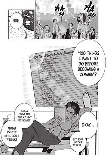 Zom 100 : Bucket List of the Dead (Zom 100 - Zombie ni Naru Made ni Shitai 100 no Koto) est une série toujours en cours de parution au Japon et qui a connu huit tomes à ce jour aux éditions Shogakukan. La routine quotidienne peut laisser n'importe qui mort à l'intérieur. Se réveiller, aller au travail, rentrer à la maison et s'endormir n'est pas une façon de vivre. Il faut parfois se réveiller pour se rendre compte que sa vie est en train de se gâcher comme un rouage dans la machine de l'entreprise. Pour Akira Tendo, notre héros dans le nouveau manga de Haro Aso et Kotaro Takata, Zom 100 : Bucket List of the Dead, il faut la fin du monde pour se rendre compte du temps qu'il a perdu. Jour après jour, Akira travaille jusqu'à l'os dans une entreprise qui réalise des publicités. Ce qu'il pensait être son travail de jour finit par aspirer toute la joie et l'essence de son bien-être. Son patron lui crie dessus ainsi qu'à ses collègues, presque tout le monde se vante des heures supplémentaires malsaines qu'il fait, et - pire que tout - le crush de travail d'Akira se tape une des personnes les plus haut placées. C'est, comme on peut l'imaginer, le pire scénario que puisse vivre un habitant d'un pays industrialisé. Mais tout change un jour, quand Akira se réveille et découvre que les morts-vivants ont pris le contrôle de la nation. Malgré la peur d'être dévoré par les zombies, Akira se sent libre pour la première fois depuis longtemps. Après avoir annoncé à son patron (zombifié) qu'il démissionnait et avoir avoué ses sentiments à son amour (zombifié aussi), Akira commence à dresser une liste de cent choses qu'il veut faire avant de rejoindre les rangs des morts-vivants.