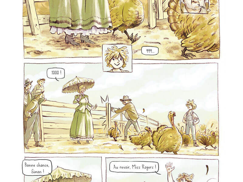 Léonie Bischoff ("Anaïs", inspirée des carnets d'Anaïs Nin) nous revient avec cette première bande dessinée destinée aux enfants, petits et grands, dès 8 ans. Le texte est adapté du roman de Kathleen Karr publié par l' École des Loisirs. Le personnage principal est un jeune garçon, Simon Green, qui vit chez sa tante et son oncle, peu aimants, depuis la mort de sa mère. Le père a disparu de la circulation. L'institutrice convoque Simon à la fin d'une journée d'école et lui annonce qu'il ne pourra pas rester une année de plus. Elle le console en lui disant que chacun doit trouver sa voie et qu'il est temps pour Simon de trouver la sienne. Simon va rencontrer ce jour-là un éleveur de dindes qui n'arrive pas à vendre ses bêtes. Ayant encore les paroles de son institutrice dans les oreilles, le gamin relève le défi et propose au bonhomme de les lui acheter pour aller les vendre dans une grande ville, Denver en l'occurrence. Mais il lui faut encore un chariot et surtout un muletier pour l'accompagner...