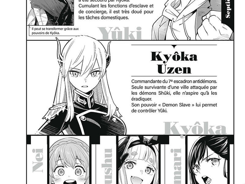 Demon Slave (Mato Seihei no Slave) est un manga toujours en cours de parution au Japon et qui a connu onze tomes à ce jour aux éditions Shueisha. Après qu'une autre dimension se soit matérialisée dans notre monde, la terre a changé. Dans la soi-disant dimension Mato, il y a des démons qui menacent également les gens sur notre planète. L'humanité n'est pas complètement sans défense. Dans la deuxième dimension, il y a des fruits - des pêches - qui donnent de la force. Mais pas à tous, seulement ceux qui ont un grand pouvoir spirituel. Dans ce cas, ce sont principalement les femmes qui s'occupent de combattre les démons. Les hommes sont plutôt inutiles et sont considérés comme d'importance secondaire dans la société. Il en va de même pour le lycéen Yuki comme pour tous les hommes. Travaillez et obéissez aux femmes. Il n'est pas vraiment mécontent, mais l'avenir ne lui semble pas radieux. Par hasard, il entre dans la dimension Mato via un portail. Il est entouré de démons et ses chances de survie sont presque nulles. Un commandant de l'unité de combat de démons apparaît. Comme toutes les femmes qui ont mangé des pêches, Kyoka Uzen a des compétences particulières. En tant que commandante de la 7e unité du régiment anti-démon, elle peut libérer des pouvoirs cachés. Une compétence qui n'est pas très respectée. Kyoka y voit même là un obstacle à ce qu'elle devienne commandant général. Puisque Yuki et Kyoka sont entourés de monstres, il n'y a qu'un seul moyen d'échapper à la mort. Kyoka applique ses compétences sur le garçon. La seule condition ? Yuki doit devenir son esclave.