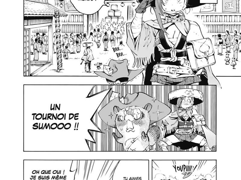 Dans ce cinquième tome, Monko est toujours recherchée par les forces d'élite du Shogunat. Accompagnée de son blaireau Pokamatsu, la jeune femme s'apprête pourtant à connaître une parenthèse assez réconfortante lors d'un tournoi de sumo, surtout lorsque l'un des lutteurs est tout à fait à son goût. En parallèle, la chasseuse de primes Oryô Dixie la musclée (voir tome 1) marque son retour et traque des bandits sans véritable épaisseur, mais il faut bien travailler pour gagner sa vie. Hasard ou coïncidence, Oryô croise à nouveau la route de Monko et grâce à l'aide de Pokamatsu, elle sauvera Monko des griffes du sumotori qui n'hésite pas à amuser de sa stature pour séduire et droguer ses victimes. Toutefois, Monko refuse de prendre sous son aile l'ancienne cowgirl. S'ensuit un chapitre beaucoup plus calme et fortement axé sur le fan service (mais avec humour). Oryô semble déconcertée face à Monko, à tel point que les deux protagonistes semblent "échanger" leur personnalité au fil des pages (l'une devient plus dure, l'autre beaucoup plus souple). Enfin, Monko repart de plus bel à la recherche d'un célibataire, la breteuse croisera dans les pages un routard infidèle ou encore un policier incorruptible. Cependant, cette fois, elle a de la concurrence et ce sont deux visions de l'amour qui vont s'affronter. D'un côté une approche très fleur bleue et romantique, de l'autre une préférence pour profiter de l'instant présent quitte à multiplier les rencontres sans lendemain.  Le dessin est quant à lui toujours aussi soutenu, avec un sens aiguisé de la mise en scène, une galerie de personnages assurément excentriques, et une ambiance far west très atypique, fusion du Japon de l'Ere Edo et l'Amérique des Western. Il en ressort de drôles de paysages et beaucoup d'interrogations sur la temporalité des lieux (serions nous dans un futur post-apocalyptique, où les survivants auraient décidé de rebâtir la société sous le modèle de l'Ère Edo ?). Quoiqu'il en soit, il reste encore beaucoup de sujets à solutionner pour Monko dans l'ultime à venir de la série, notamment ses origines avec l'Origami, sa quête d'un époux (ou du moins du grand amour) et sa lutte face aux Huit maréchaux.